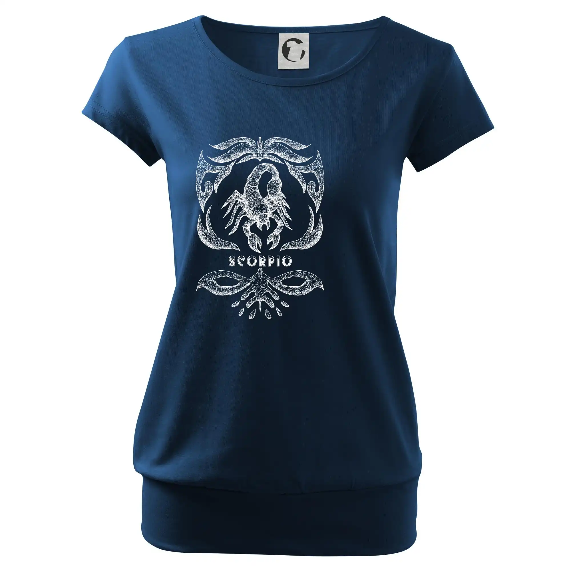 Trendové dámske tričko s veľmi krátkym rukávom, voľnejšieho strihu, v dolnom kraji všité do širokého lemu. Okrúhly priekrčník s úzkym lemom zo zhodného materiálu.