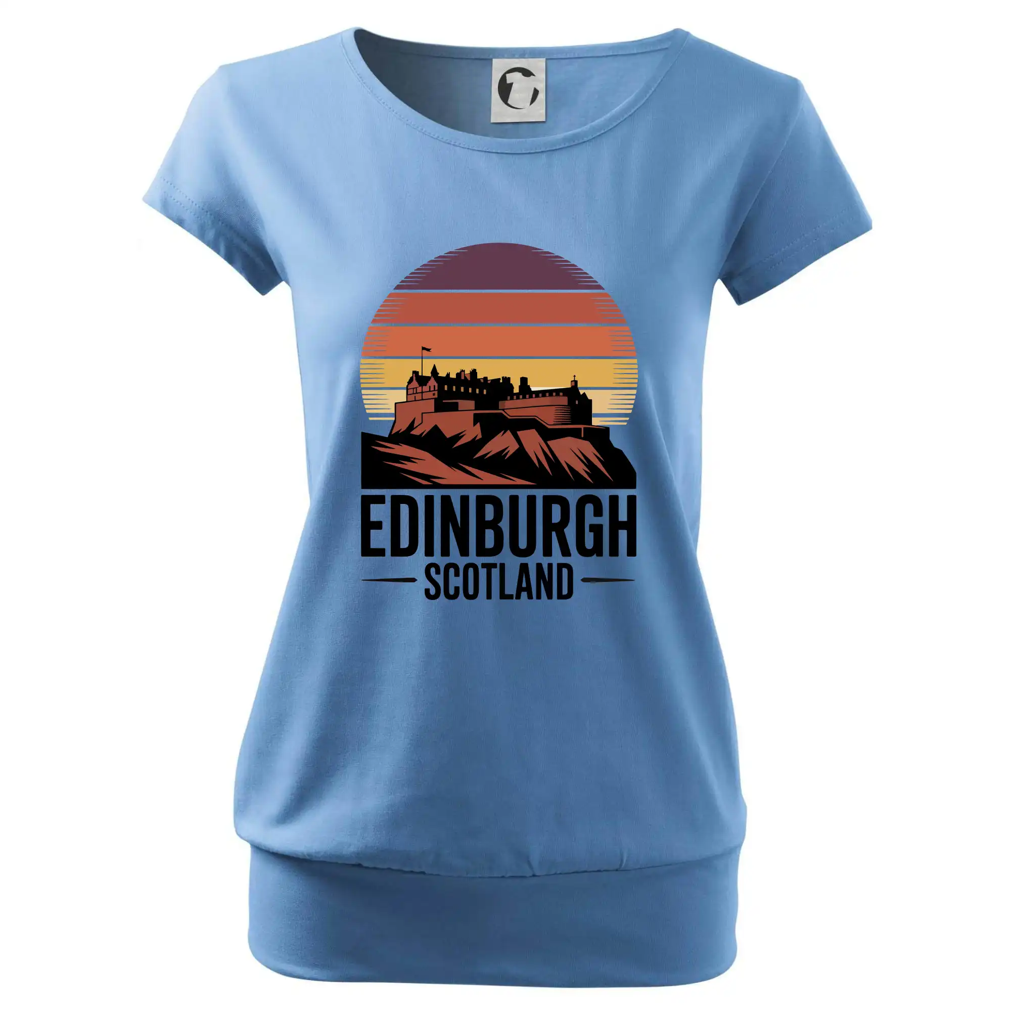 Trendové dámske tričko s veľmi krátkym rukávom, voľnejšieho strihu, v dolnom kraji všité do širokého lemu. Okrúhly priekrčník s úzkym lemom zo zhodného materiálu.