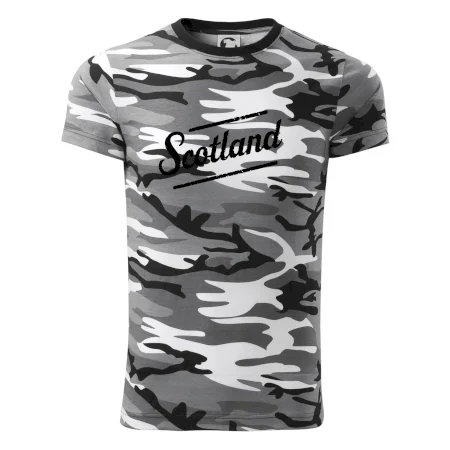 Tričko strednej gramáže vo farbách camouflage. Strih s bočnými švami. Lem priekrčníku z rebrového úpletu s prídavkom 5% elastanu. Vnútorná časť zadného priekrčníka začistená páskou vo farbe camouflage.