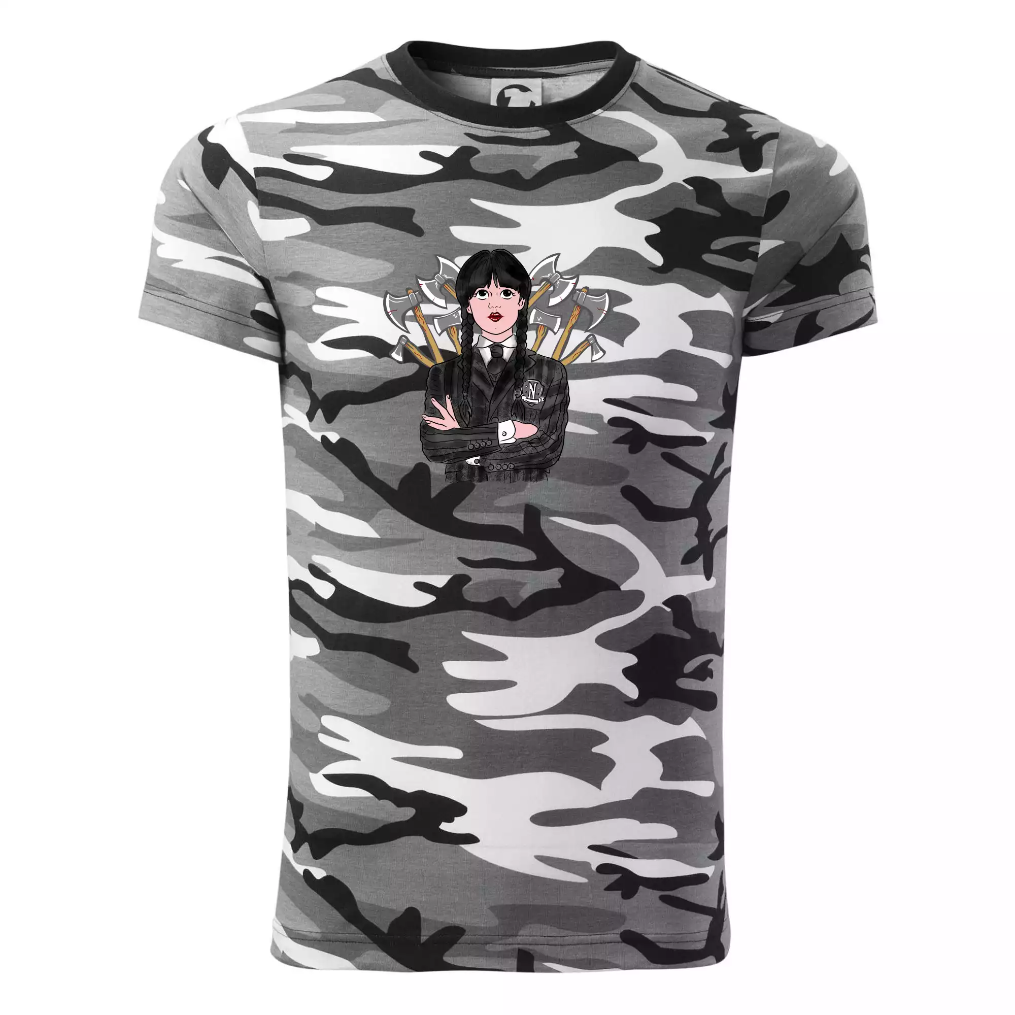 Tričko strednej gramáže vo farbách camouflage. Strih s bočnými švami. Lem priekrčníku z rebrového úpletu s prídavkom 5% elastanu. Vnútorná časť zadného priekrčníka začistená páskou vo farbe camouflage.