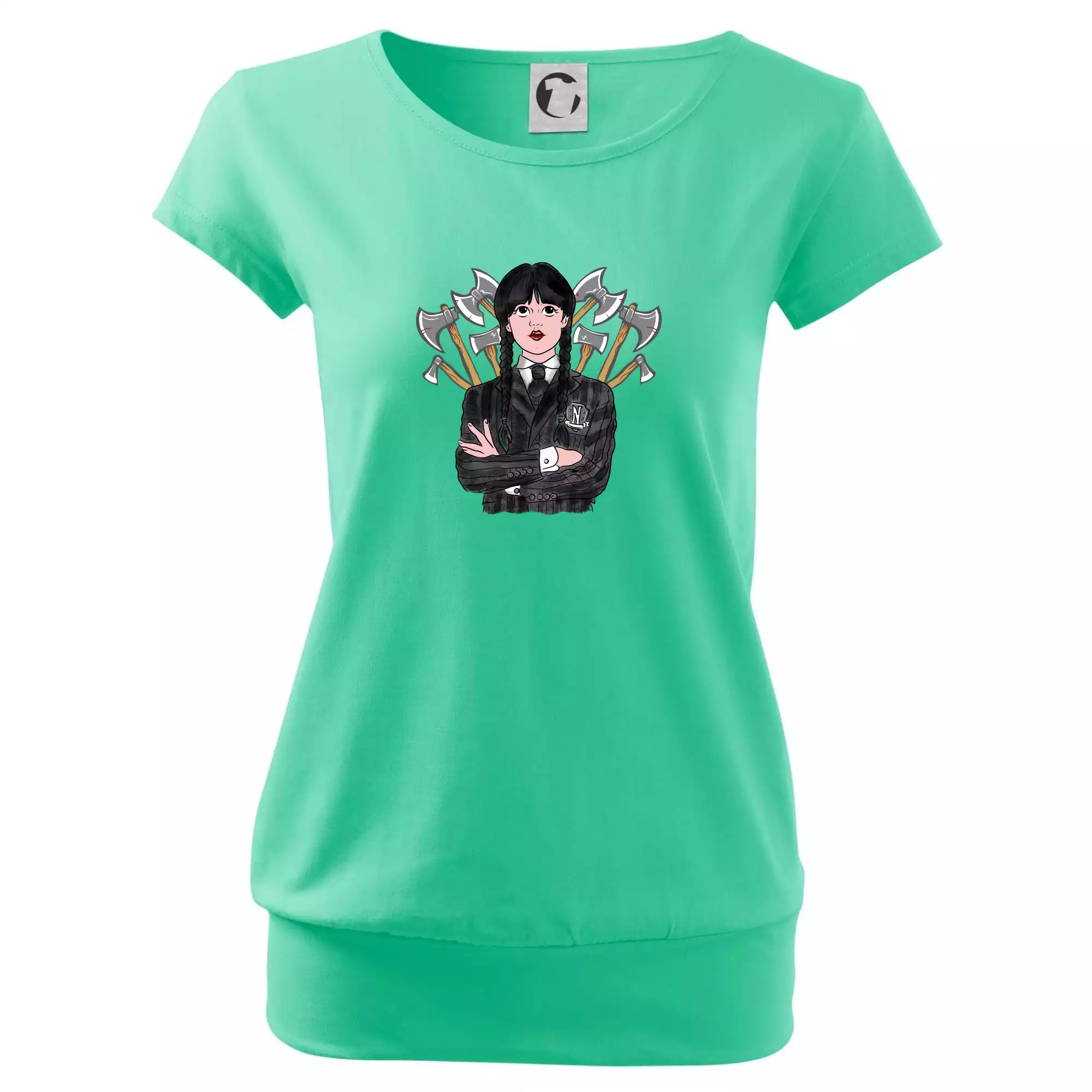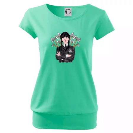 Trendové dámske tričko s veľmi krátkym rukávom, voľnejšieho strihu, v dolnom kraji všité do širokého lemu. Okrúhly priekrčník s úzkym lemom zo zhodného materiálu.