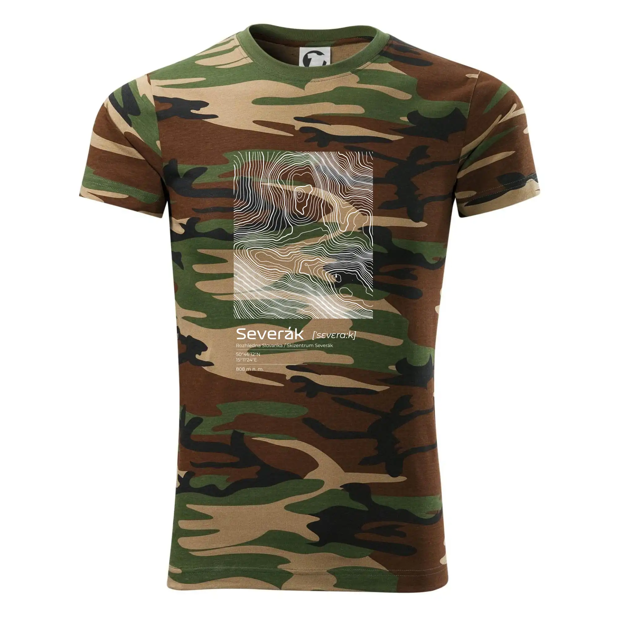 Tričko strednej gramáže vo farbách camouflage. Strih s bočnými švami. Lem priekrčníku z rebrového úpletu s prídavkom 5% elastanu. Vnútorná časť zadného priekrčníka začistená páskou vo farbe camouflage.