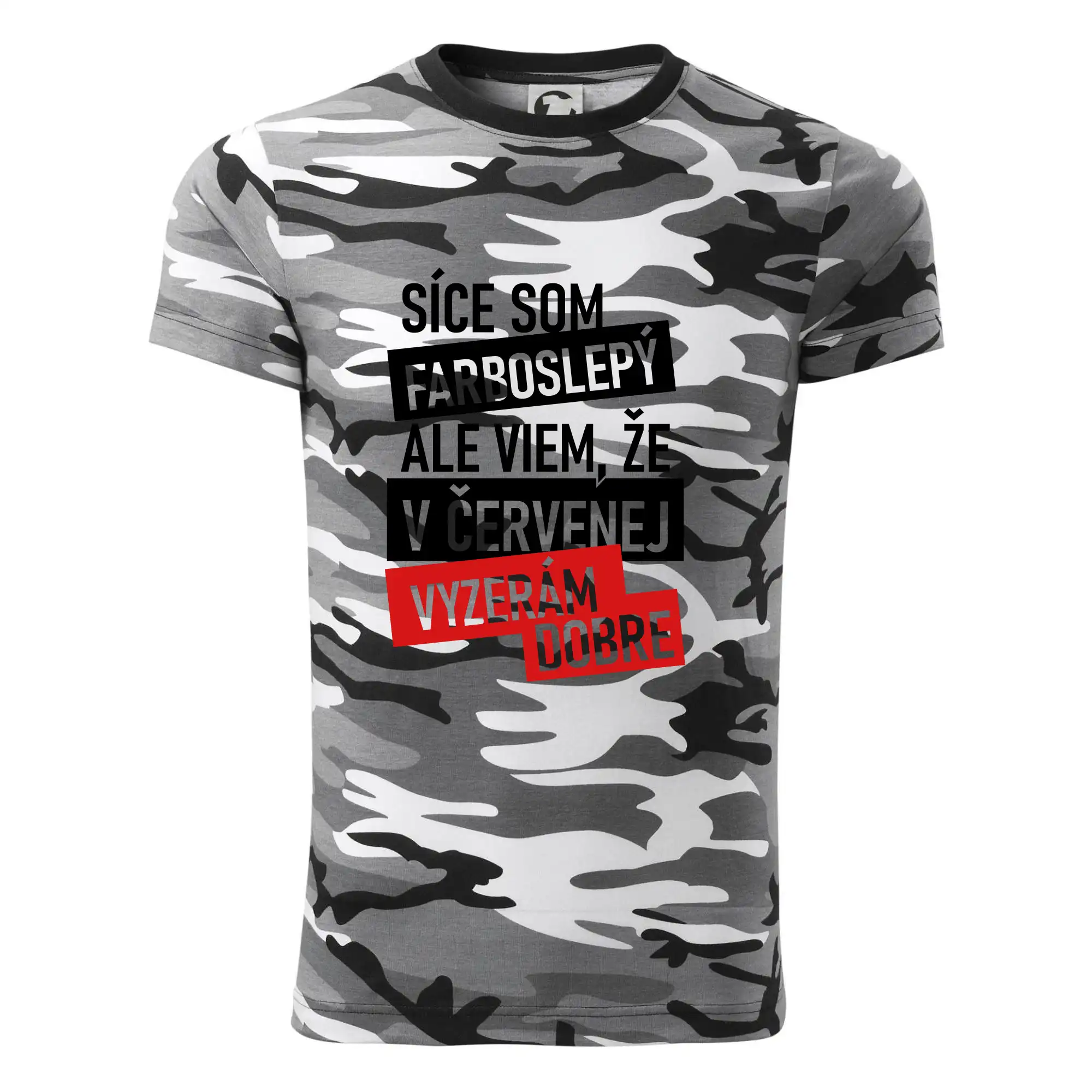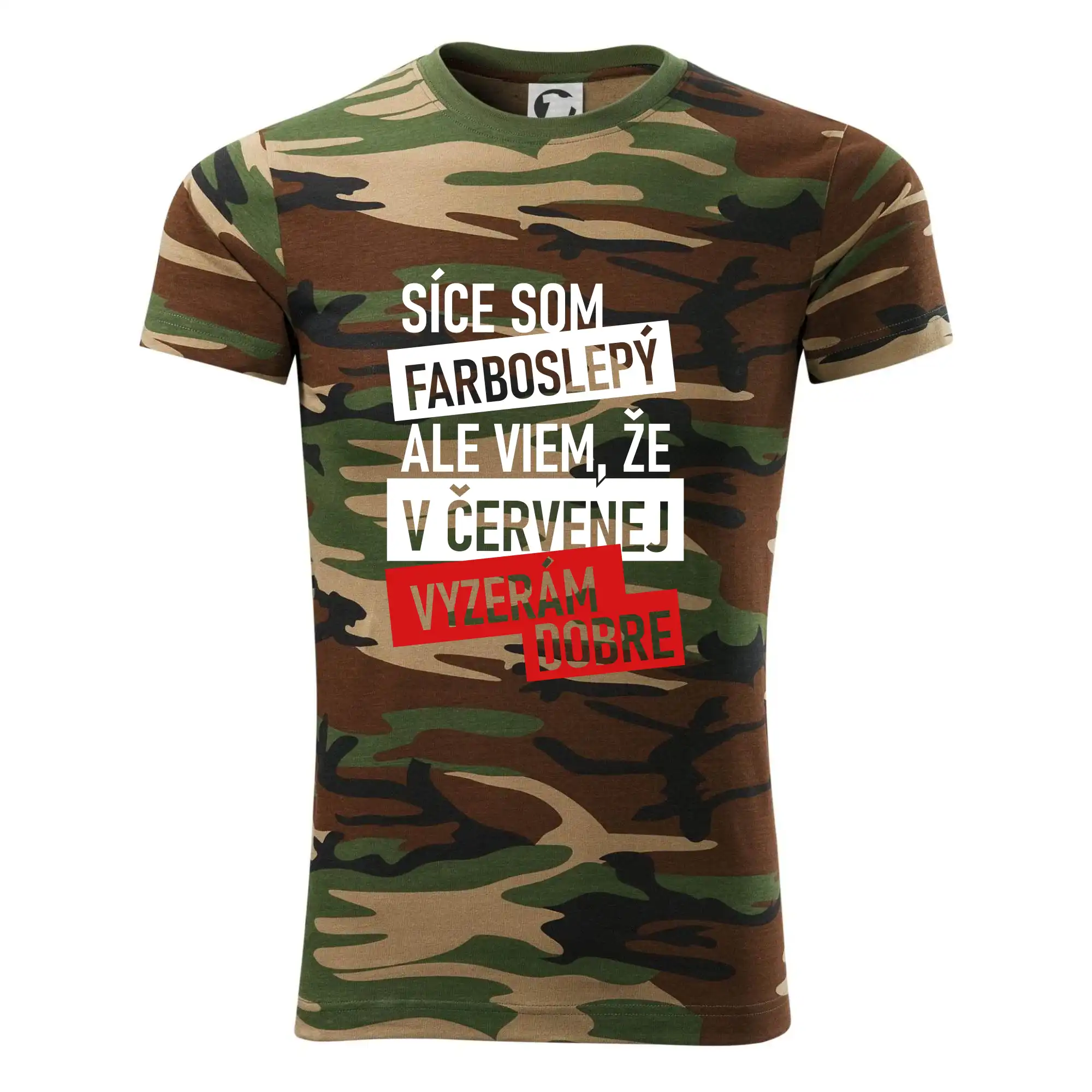 Tričko strednej gramáže vo farbách camouflage. Strih s bočnými švami. Lem priekrčníku z rebrového úpletu s prídavkom 5% elastanu. Vnútorná časť zadného priekrčníka začistená páskou vo farbe camouflage.