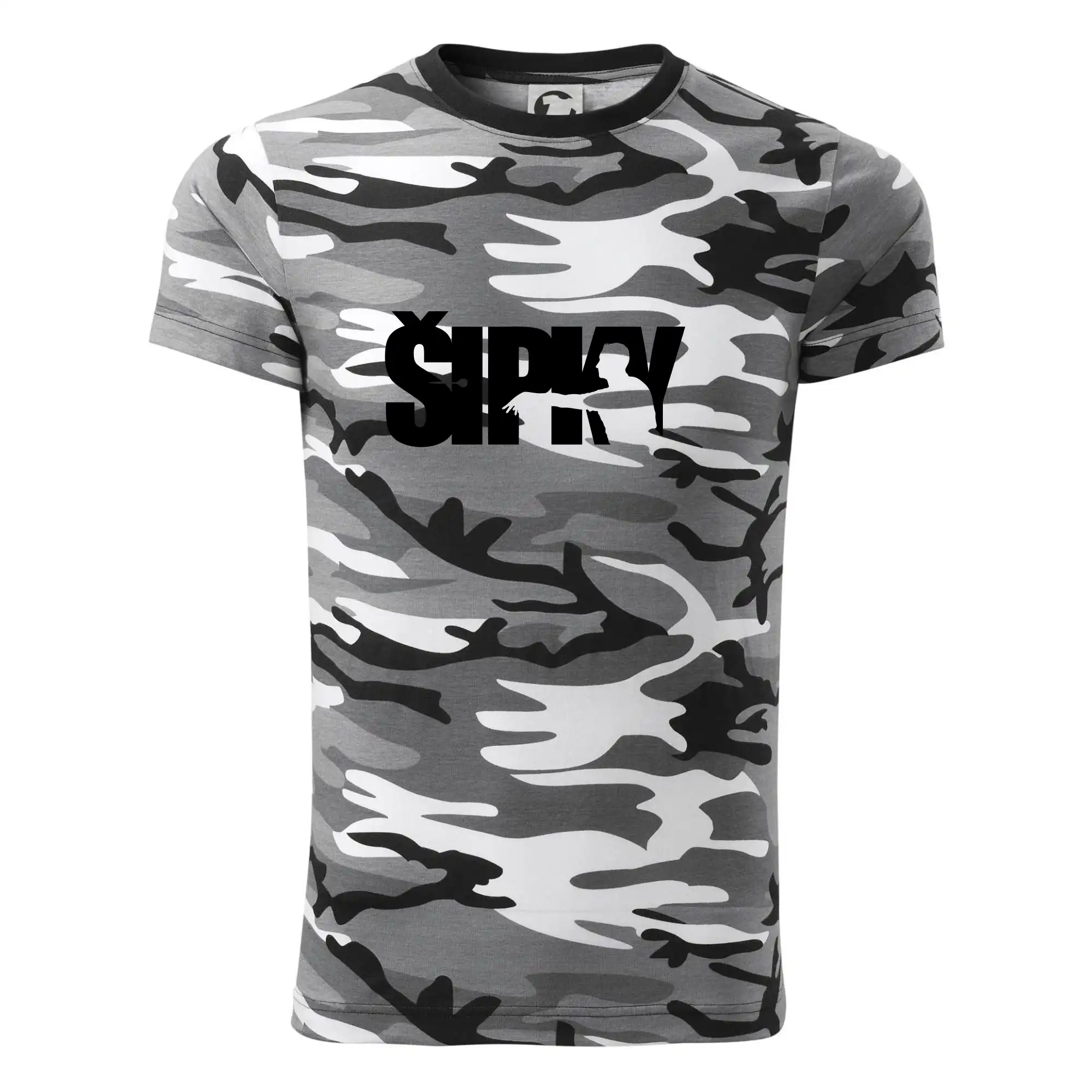 Tričko strednej gramáže vo farbách camouflage. Strih s bočnými švami. Lem priekrčníku z rebrového úpletu s prídavkom 5% elastanu. Vnútorná časť zadného priekrčníka začistená páskou vo farbe camouflage.