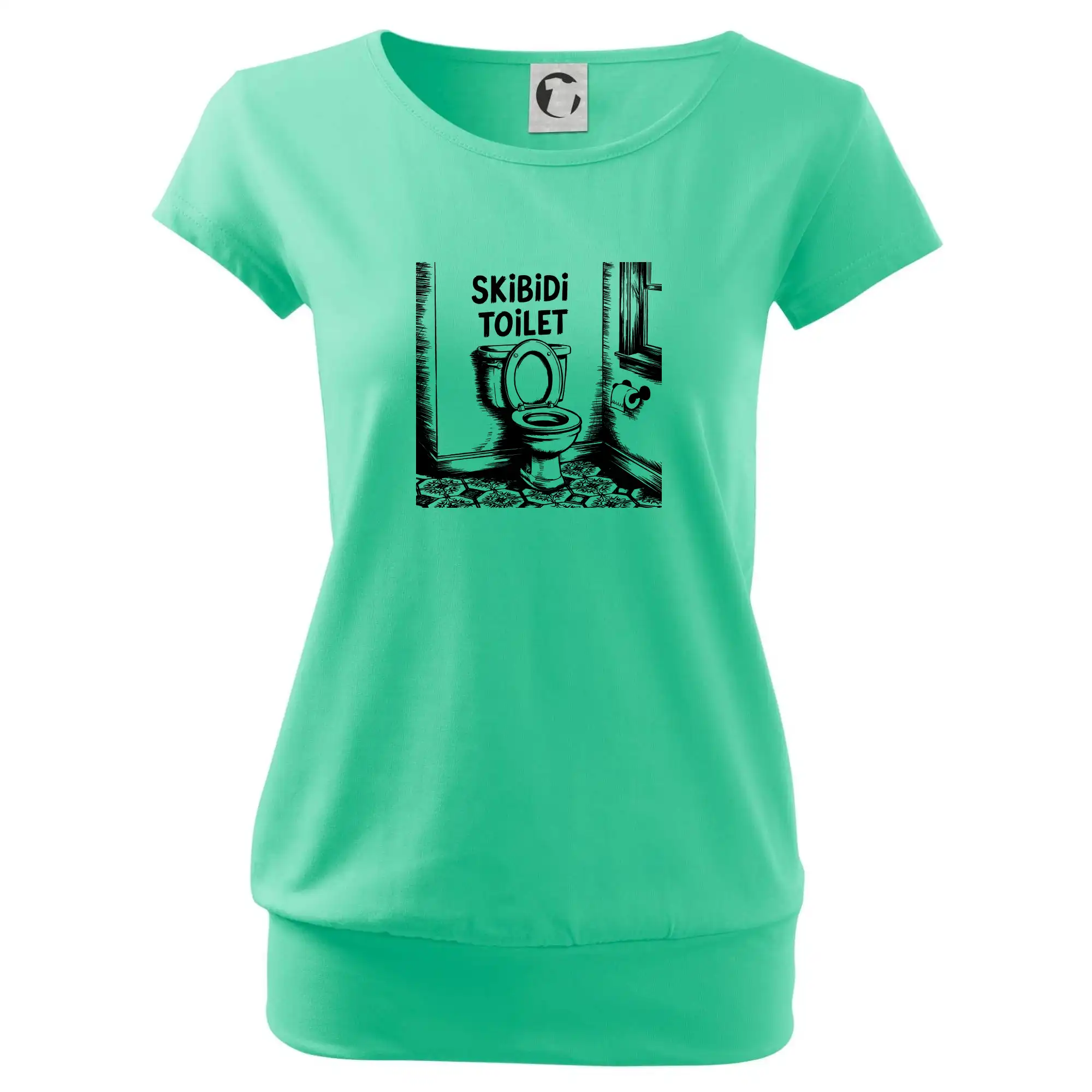 Trendové dámske tričko s veľmi krátkym rukávom, voľnejšieho strihu, v dolnom kraji všité do širokého lemu. Okrúhly priekrčník s úzkym lemom zo zhodného materiálu.