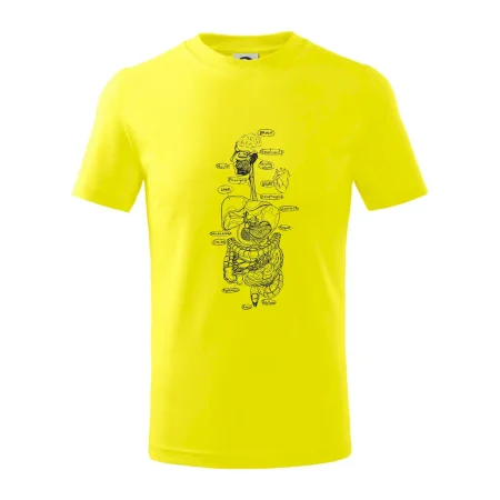 Detské tričko strednej gramáže s bočnými švami. Úzky priekrčník s prídavkom 5% elastanu. Vnútorná časť zadného priekrčníka začistená tkanou páskou. Spevnený ramenný šev.