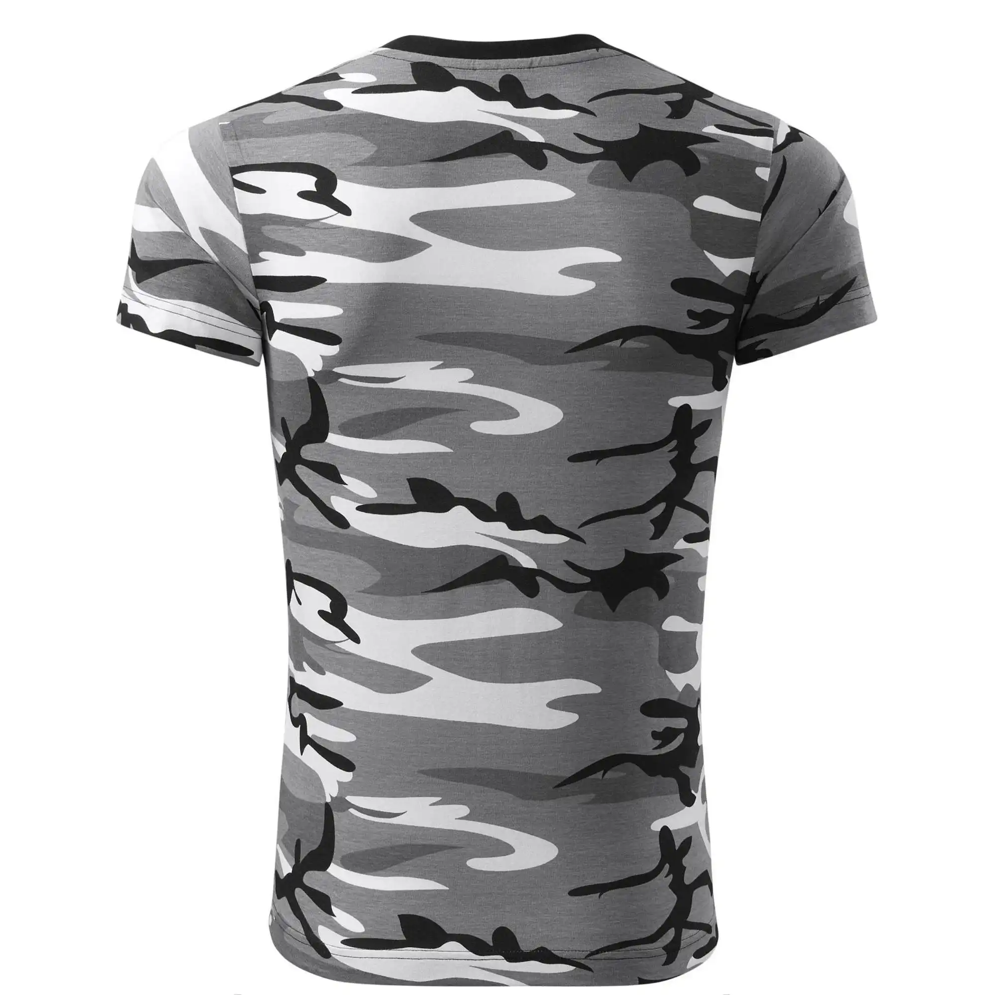 Tričko strednej gramáže vo farbách camouflage. Strih s bočnými švami. Lem priekrčníku z rebrového úpletu s prídavkom 5% elastanu. Vnútorná časť zadného priekrčníka začistená páskou vo farbe camouflage.