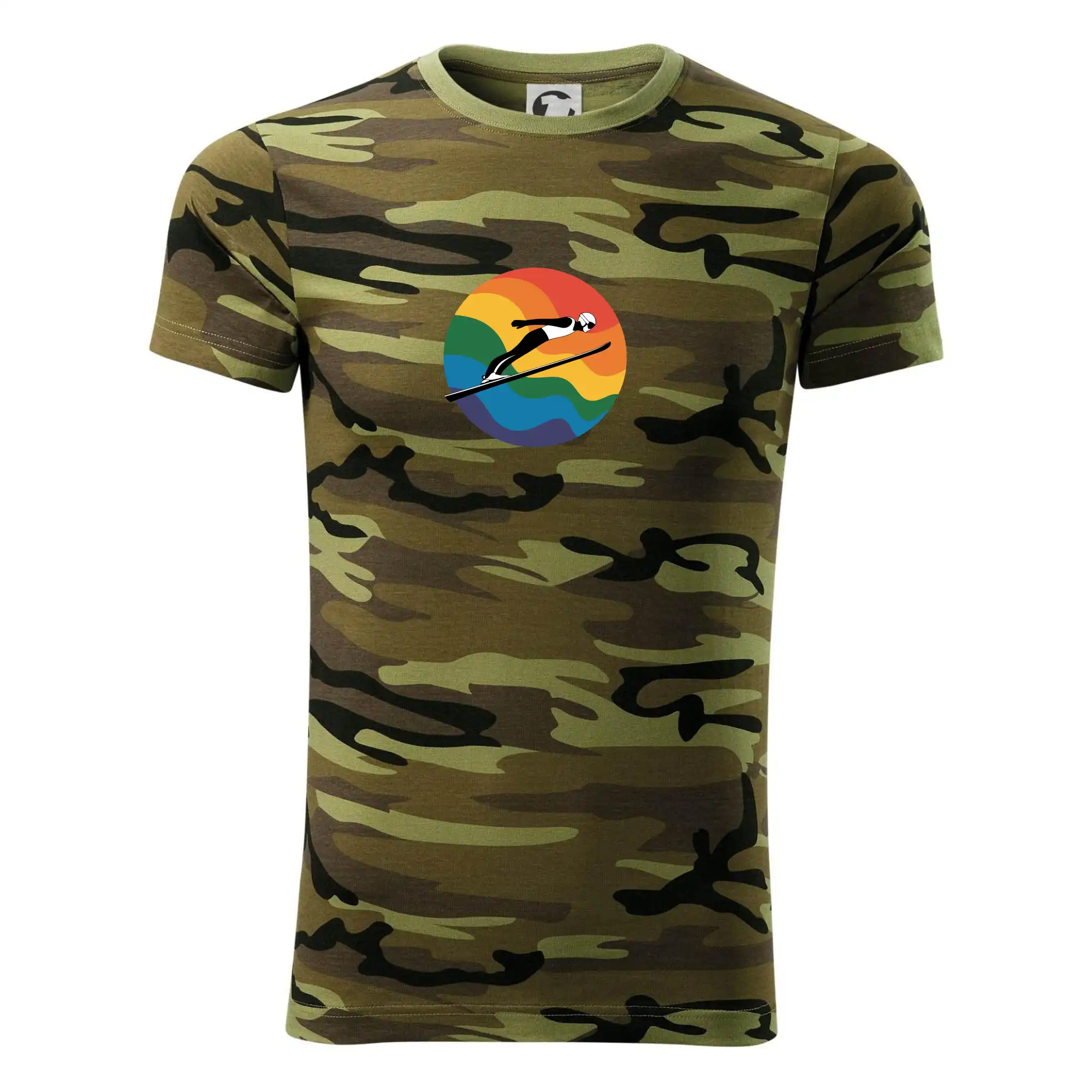 Tričko strednej gramáže vo farbách camouflage. Strih s bočnými švami. Lem priekrčníku z rebrového úpletu s prídavkom 5% elastanu. Vnútorná časť zadného priekrčníka začistená páskou vo farbe camouflage.