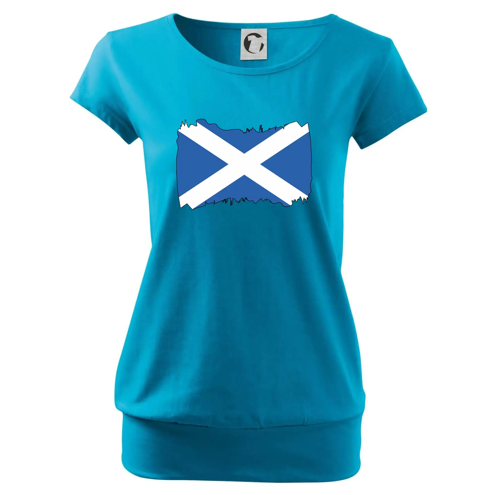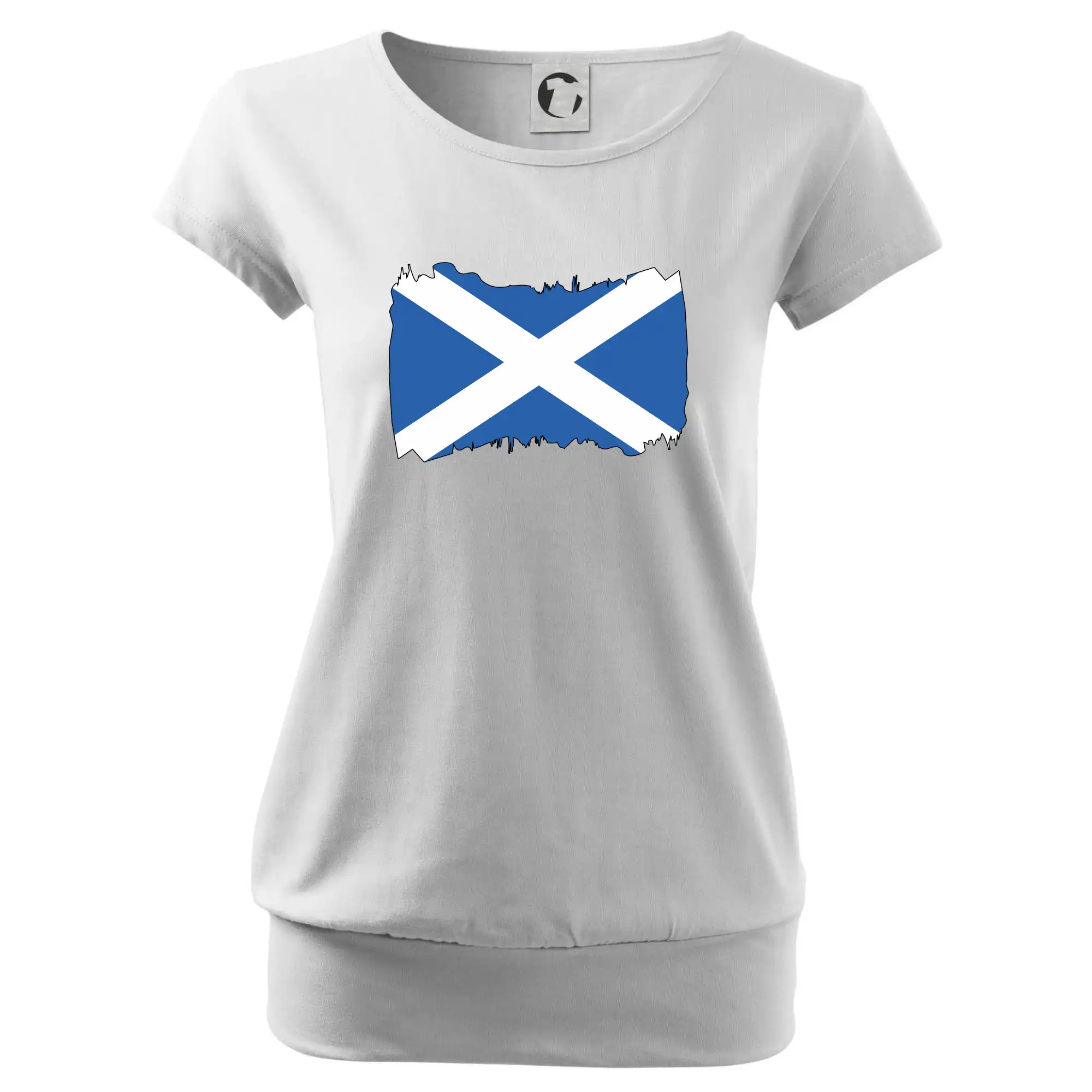 Trendové dámske tričko s veľmi krátkym rukávom, voľnejšieho strihu, v dolnom kraji všité do širokého lemu. Okrúhly priekrčník s úzkym lemom zo zhodného materiálu.