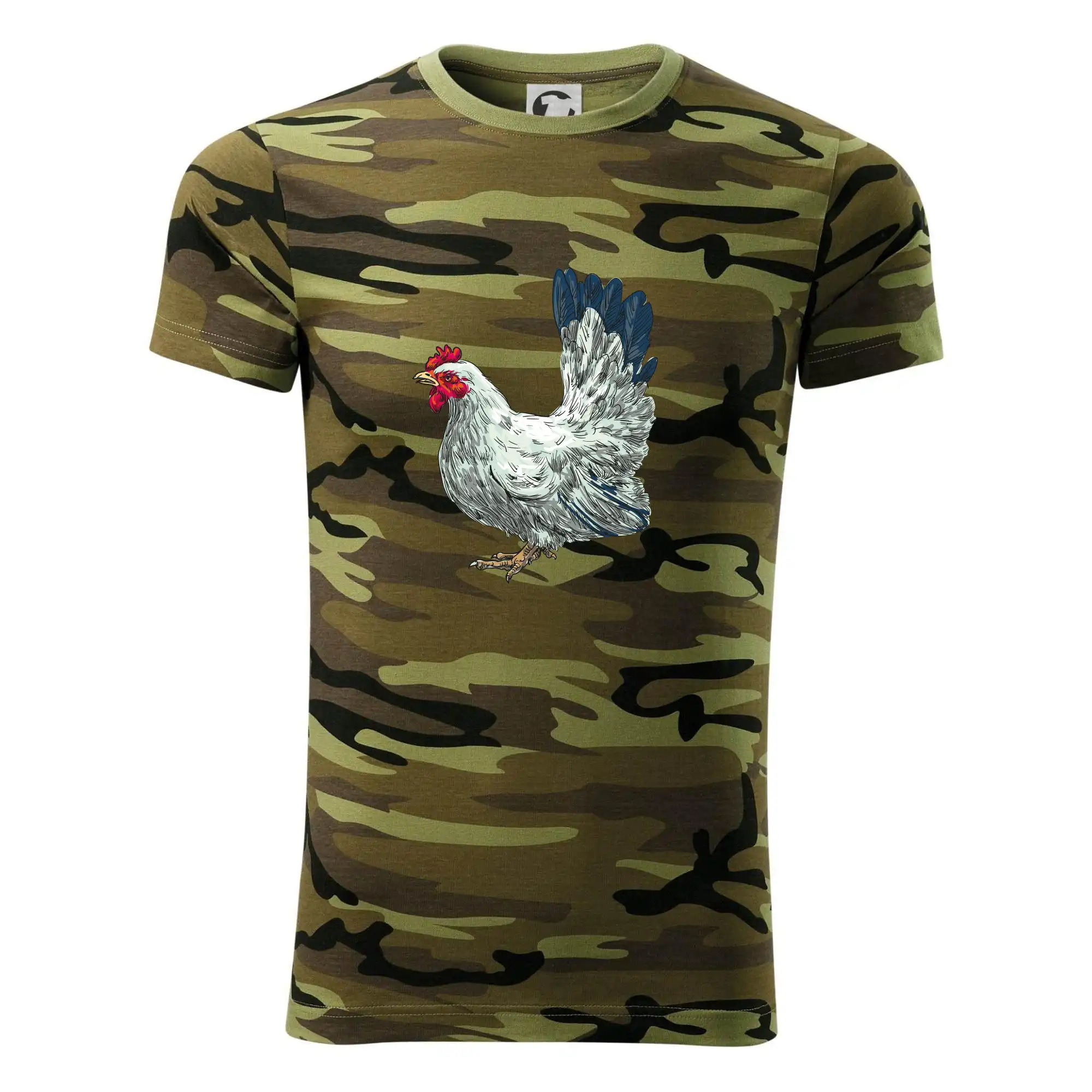 Tričko strednej gramáže vo farbách camouflage. Strih s bočnými švami. Lem priekrčníku z rebrového úpletu s prídavkom 5% elastanu. Vnútorná časť zadného priekrčníka začistená páskou vo farbe camouflage.