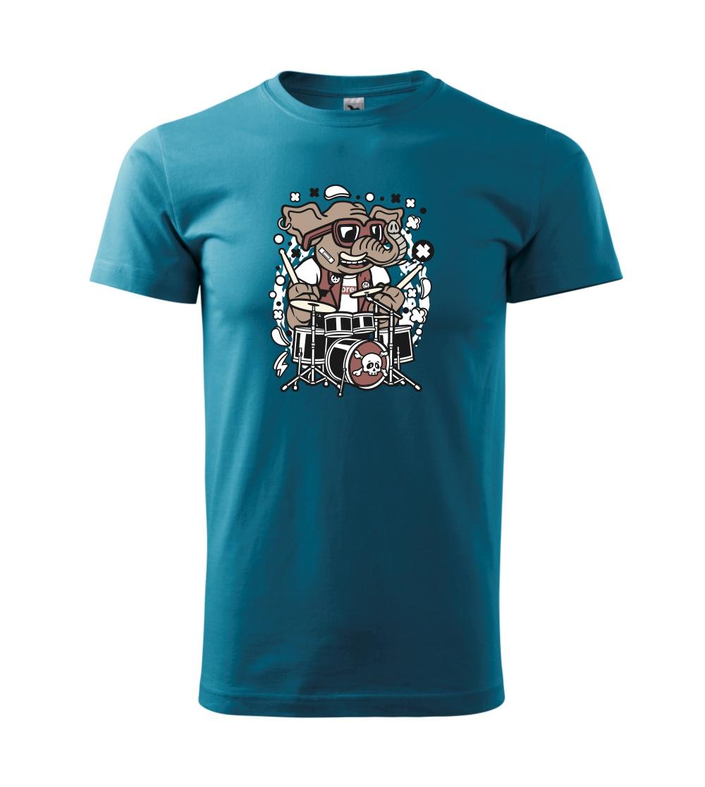 Tričko so slonom, ktorý hraje na bicie, je vhodný darček pre bubeníka.