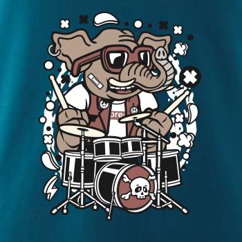 Tričko so slonom, ktorý hraje na bicie, je vhodný darček pre bubeníka.