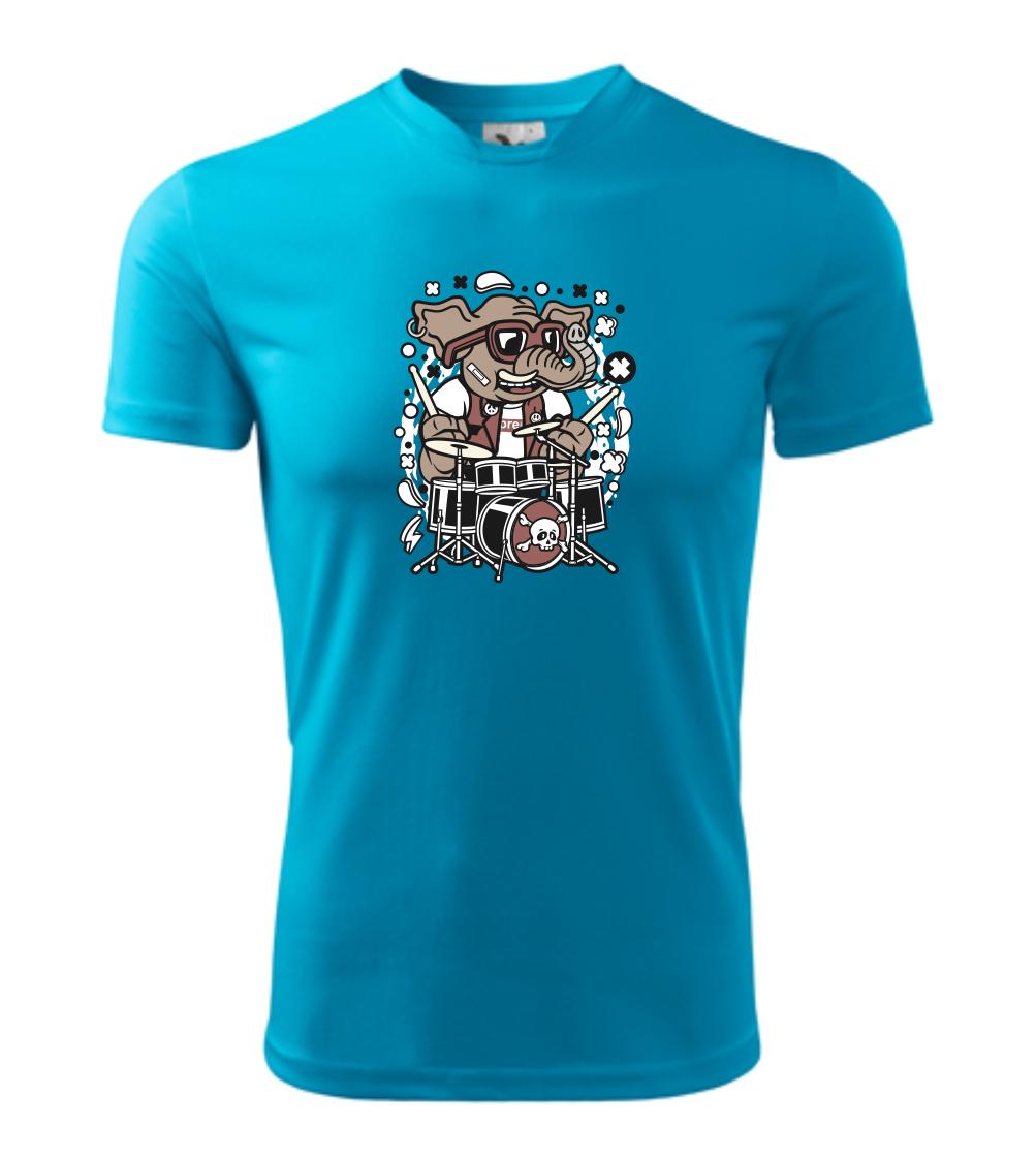 Tričko so slonom, ktorý hraje na bicie, je vhodný darček pre bubeníka.