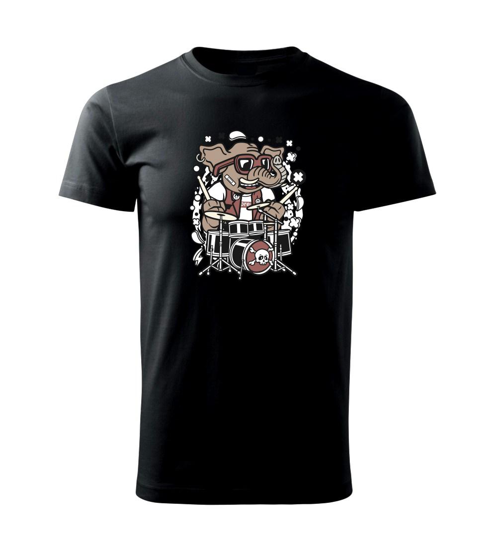 Tričko so slonom, ktorý hraje na bicie, je vhodný darček pre bubeníka.