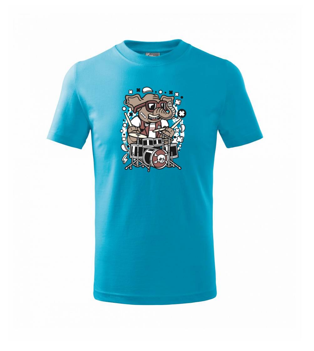 Tričko so slonom, ktorý hraje na bicie, je vhodný darček pre bubeníka.