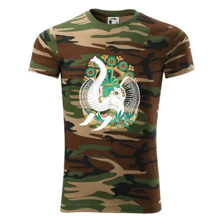Tričko strednej gramáže vo farbách camouflage. Strih s bočnými švami. Lem priekrčníku z rebrového úpletu s prídavkom 5% elastanu. Vnútorná časť zadného priekrčníka začistená páskou vo farbe camouflage.