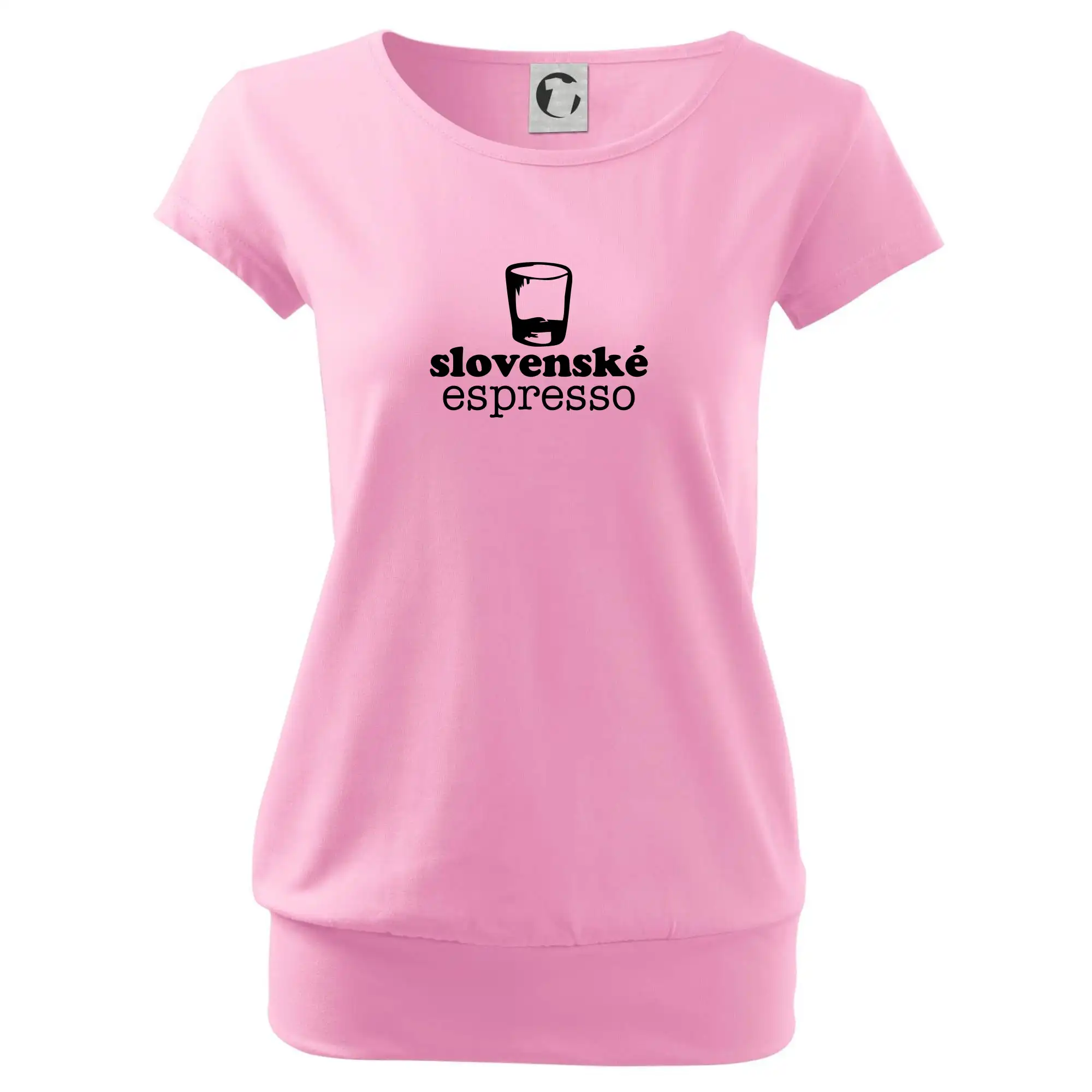 Trendové dámske tričko s veľmi krátkym rukávom, voľnejšieho strihu, v dolnom kraji všité do širokého lemu. Okrúhly priekrčník s úzkym lemom zo zhodného materiálu.