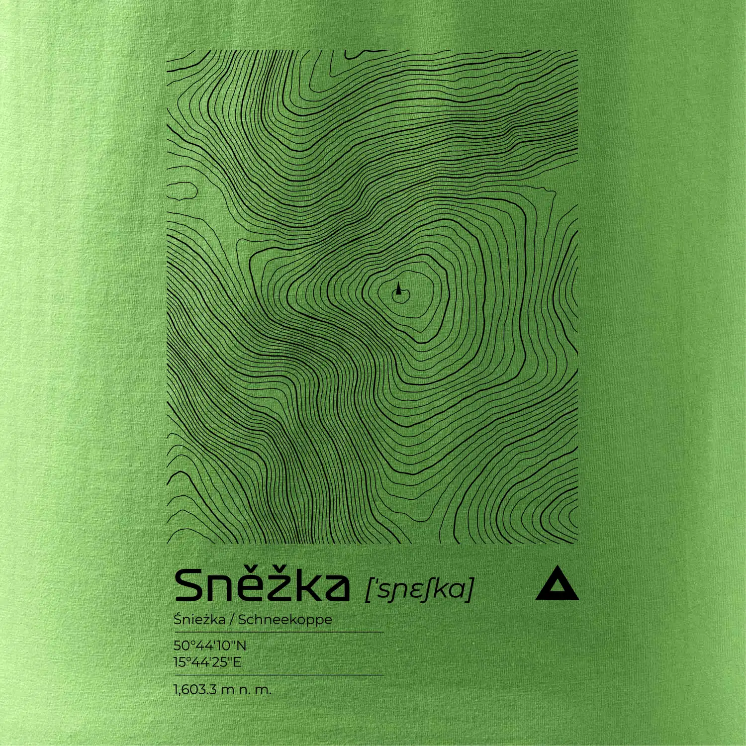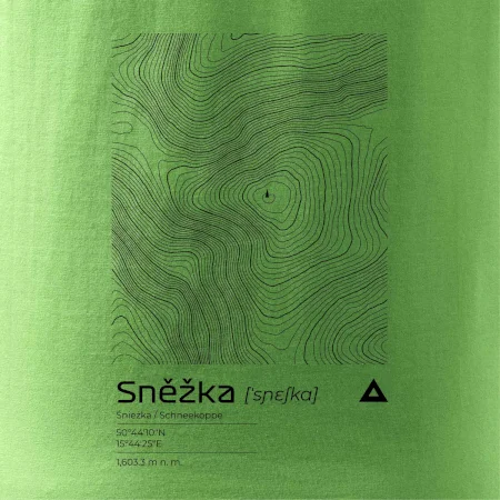 Dominantním prvkem je geometrický obdélník, který slouží jako výřez z topografické mapy. Uvnitř něj se rozplétá hustá síť vrstevnic, které věrně vykreslují unikátní reliéf Sněžky a jejího okolí. Tento kontrast mezi přísným tvarem obdélníku a organickými křivkami hor dává triku moderní, takřka umělecký nádech.