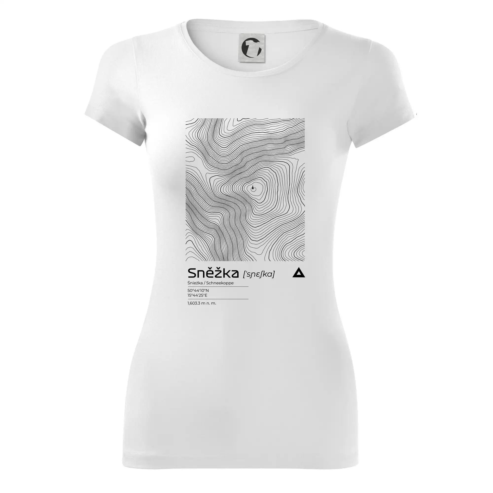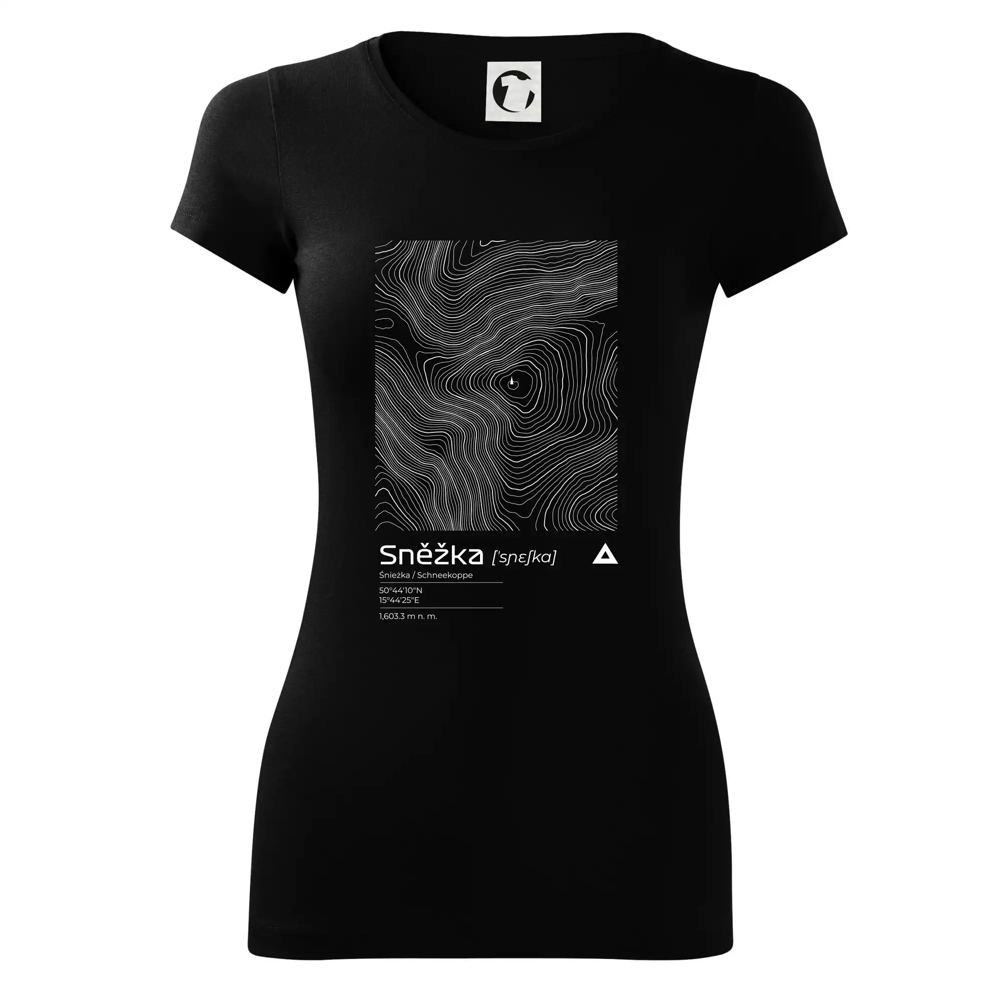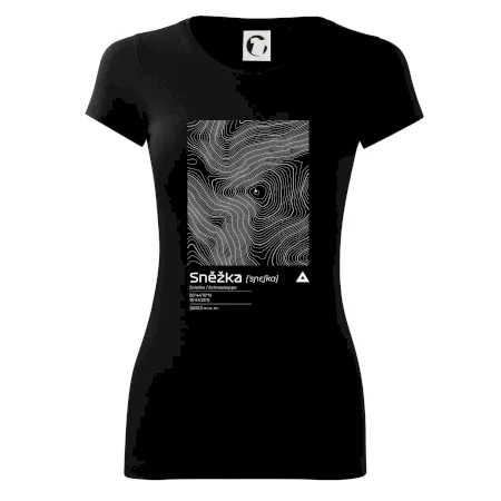Dominantním prvkem je geometrický obdélník, který slouží jako výřez z topografické mapy. Uvnitř něj se rozplétá hustá síť vrstevnic, které věrně vykreslují unikátní reliéf Sněžky a jejího okolí. Tento kontrast mezi přísným tvarem obdélníku a organickými křivkami hor dává triku moderní, takřka umělecký nádech.