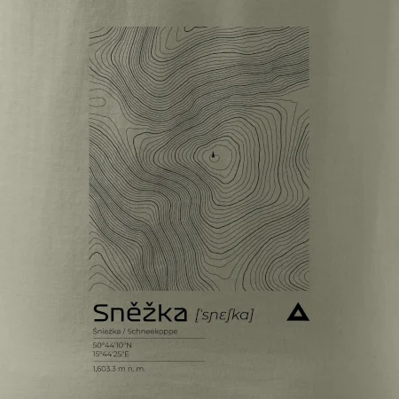 Dominantním prvkem je geometrický obdélník, který slouží jako výřez z topografické mapy. Uvnitř něj se rozplétá hustá síť vrstevnic, které věrně vykreslují unikátní reliéf Sněžky a jejího okolí. Tento kontrast mezi přísným tvarem obdélníku a organickými křivkami hor dává triku moderní, takřka umělecký nádech.