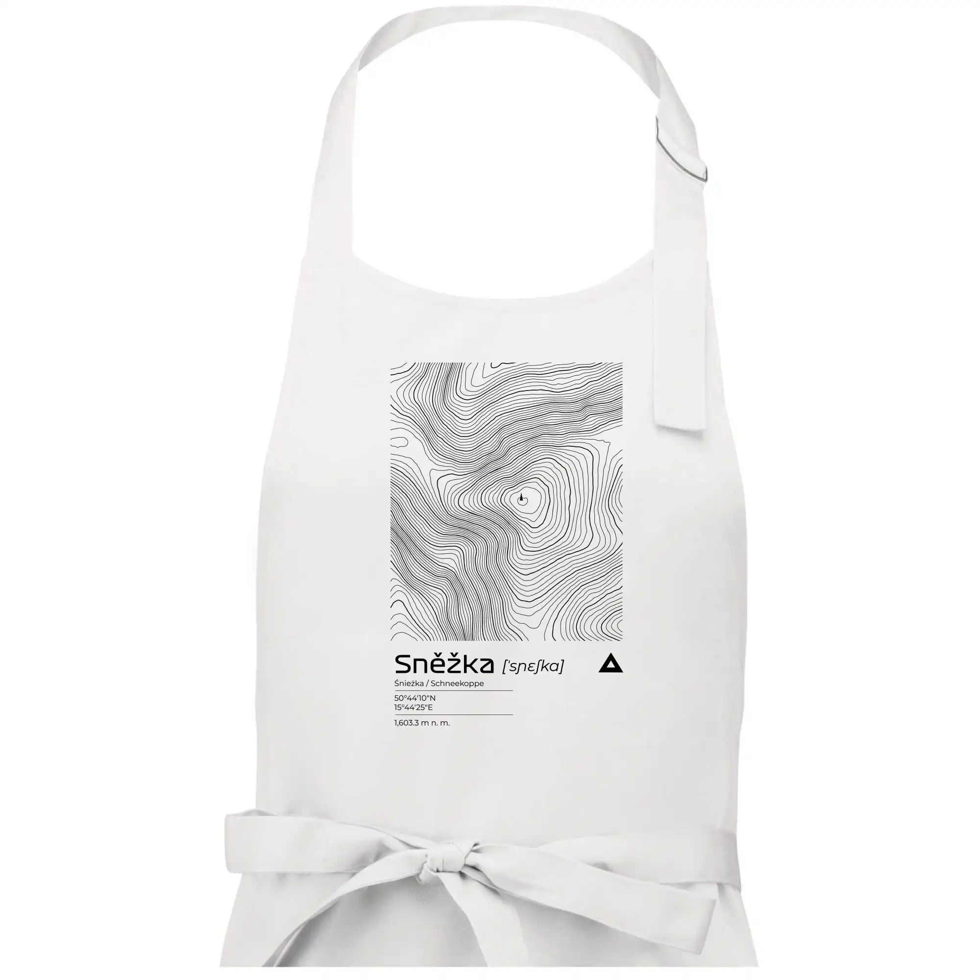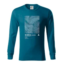 Dominantním prvkem je geometrický obdélník, který slouží jako výřez z topografické mapy. Uvnitř něj se rozplétá hustá síť vrstevnic, které věrně vykreslují unikátní reliéf Sněžky a jejího okolí. Tento kontrast mezi přísným tvarem obdélníku a organickými křivkami hor dává triku moderní, takřka umělecký nádech.