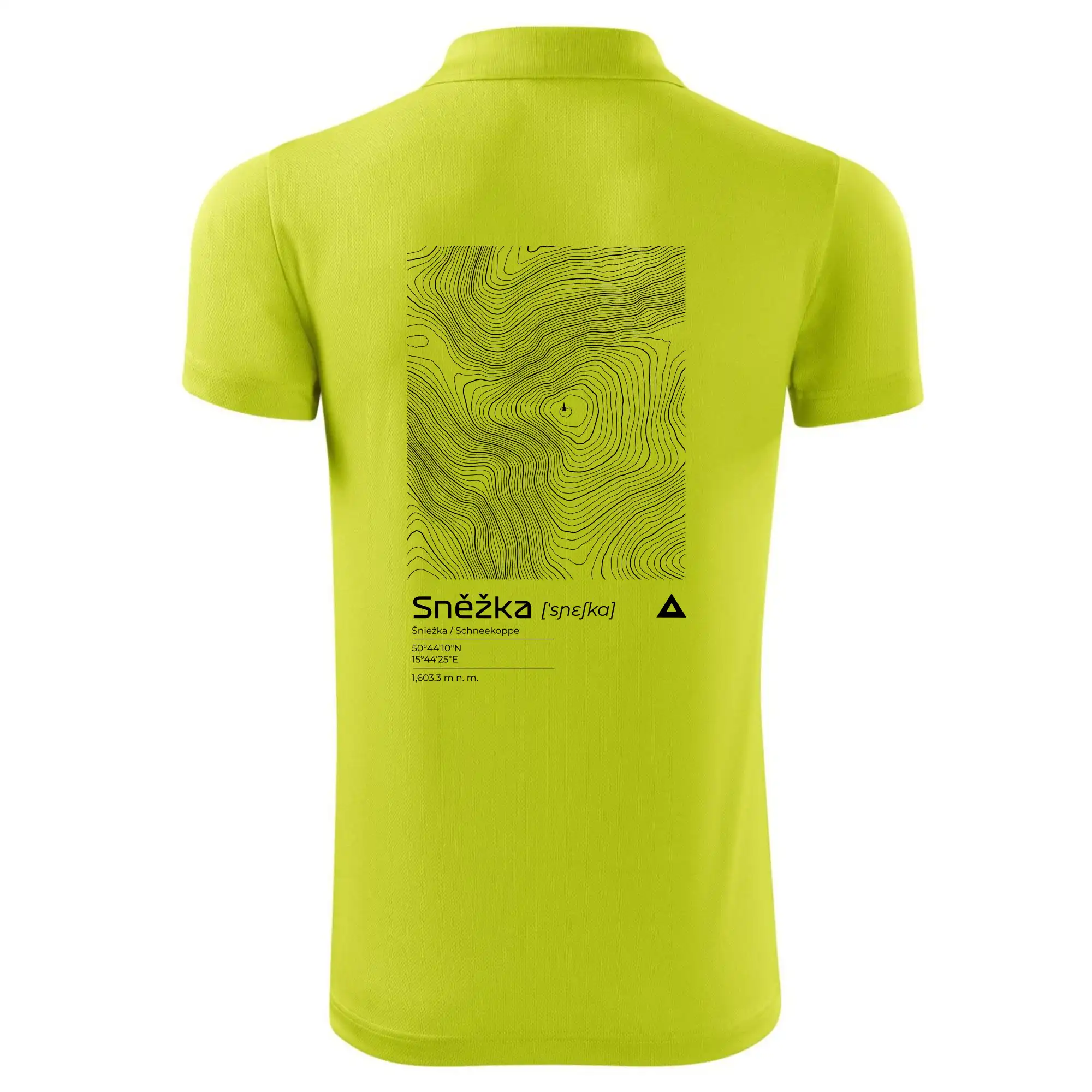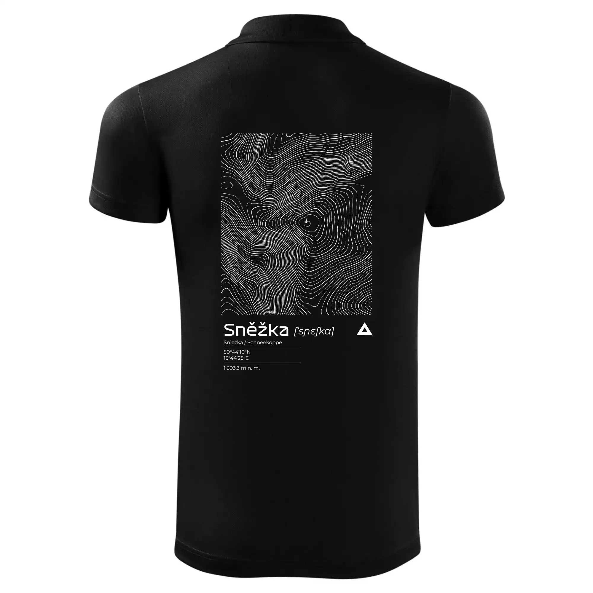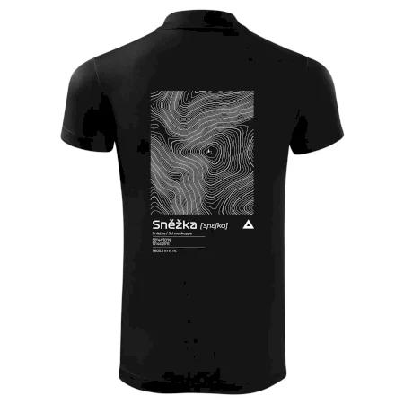 Dominantním prvkem je geometrický obdélník, který slouží jako výřez z topografické mapy. Uvnitř něj se rozplétá hustá síť vrstevnic, které věrně vykreslují unikátní reliéf Sněžky a jejího okolí. Tento kontrast mezi přísným tvarem obdélníku a organickými křivkami hor dává triku moderní, takřka umělecký nádech.