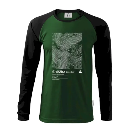 Dominantním prvkem je geometrický obdélník, který slouží jako výřez z topografické mapy. Uvnitř něj se rozplétá hustá síť vrstevnic, které věrně vykreslují unikátní reliéf Sněžky a jejího okolí. Tento kontrast mezi přísným tvarem obdélníku a organickými křivkami hor dává triku moderní, takřka umělecký nádech.