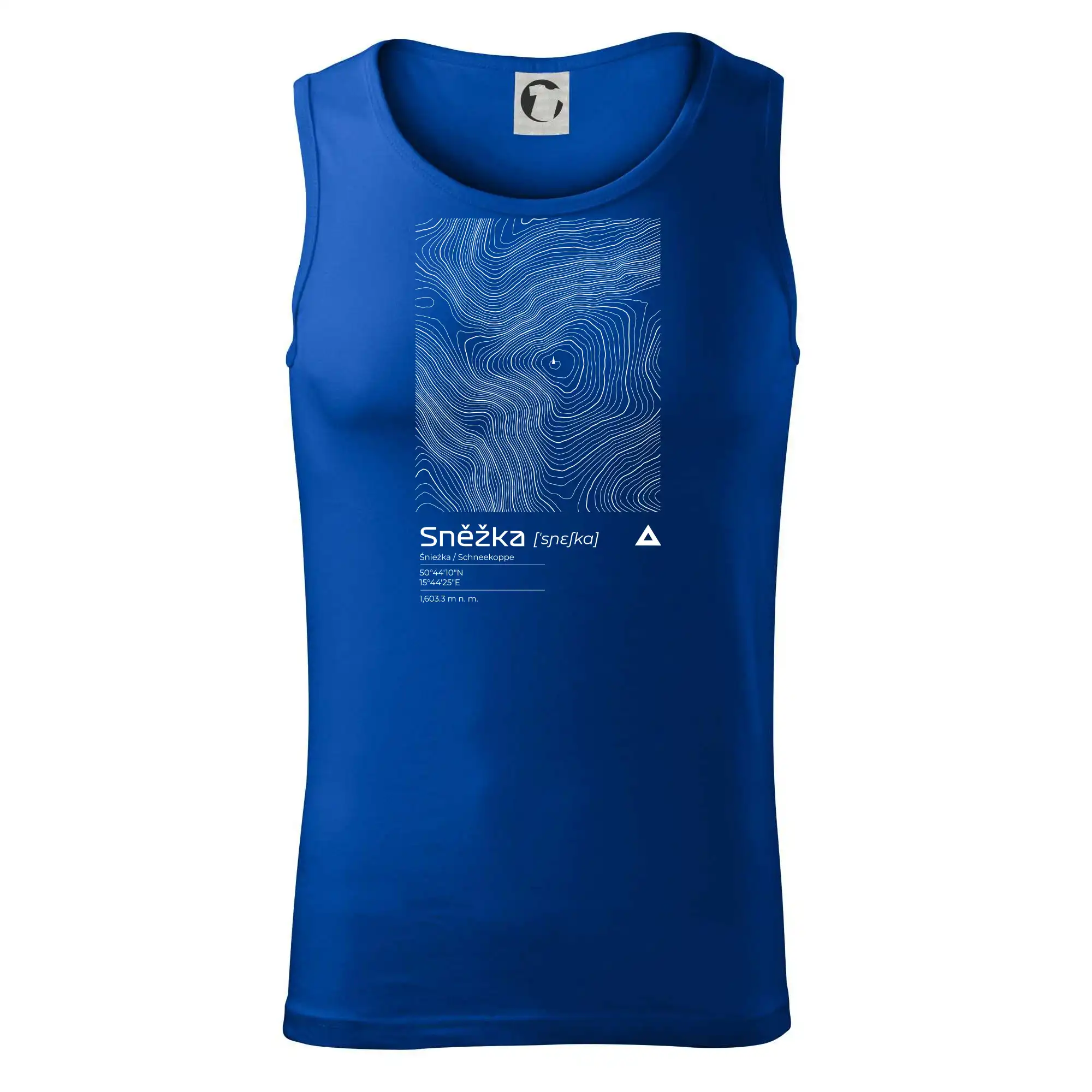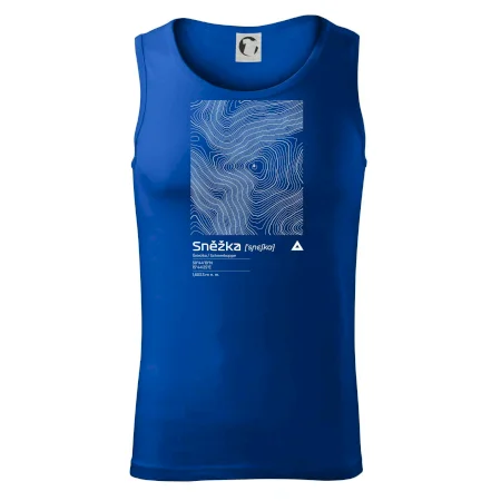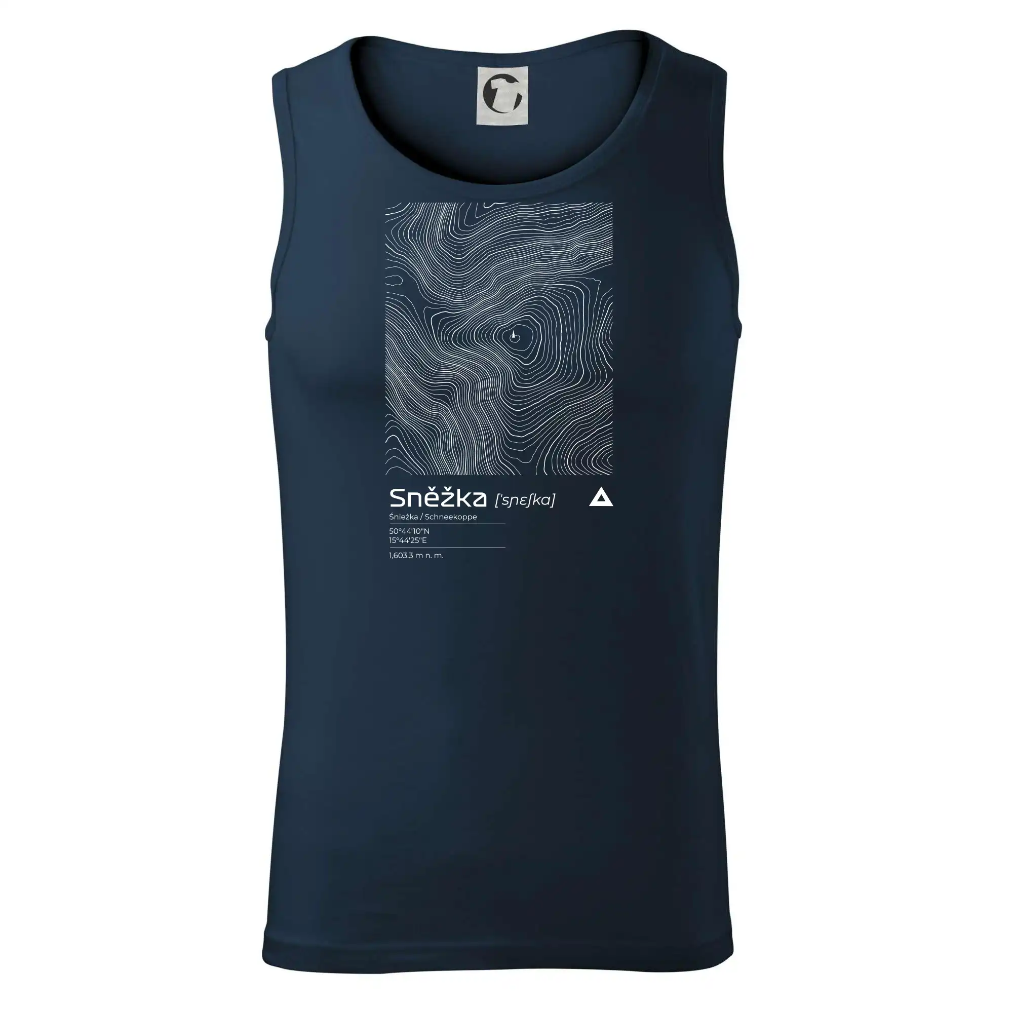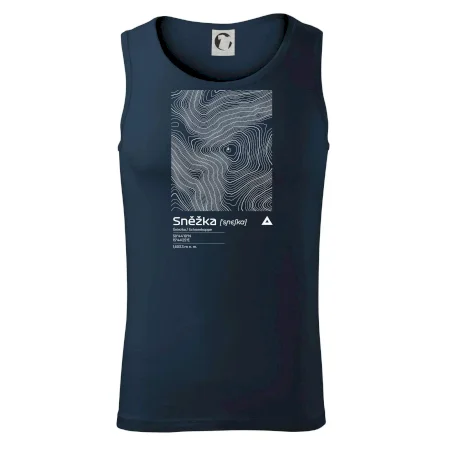 Dominantním prvkem je geometrický obdélník, který slouží jako výřez z topografické mapy. Uvnitř něj se rozplétá hustá síť vrstevnic, které věrně vykreslují unikátní reliéf Sněžky a jejího okolí. Tento kontrast mezi přísným tvarem obdélníku a organickými křivkami hor dává triku moderní, takřka umělecký nádech.