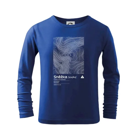 Dominantním prvkem je geometrický obdélník, který slouží jako výřez z topografické mapy. Uvnitř něj se rozplétá hustá síť vrstevnic, které věrně vykreslují unikátní reliéf Sněžky a jejího okolí. Tento kontrast mezi přísným tvarem obdélníku a organickými křivkami hor dává triku moderní, takřka umělecký nádech.