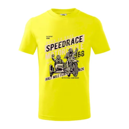 Detské tričko strednej gramáže s bočnými švami. Úzky priekrčník s prídavkom 5% elastanu. Vnútorná časť zadného priekrčníka začistená tkanou páskou. Spevnený ramenný šev.