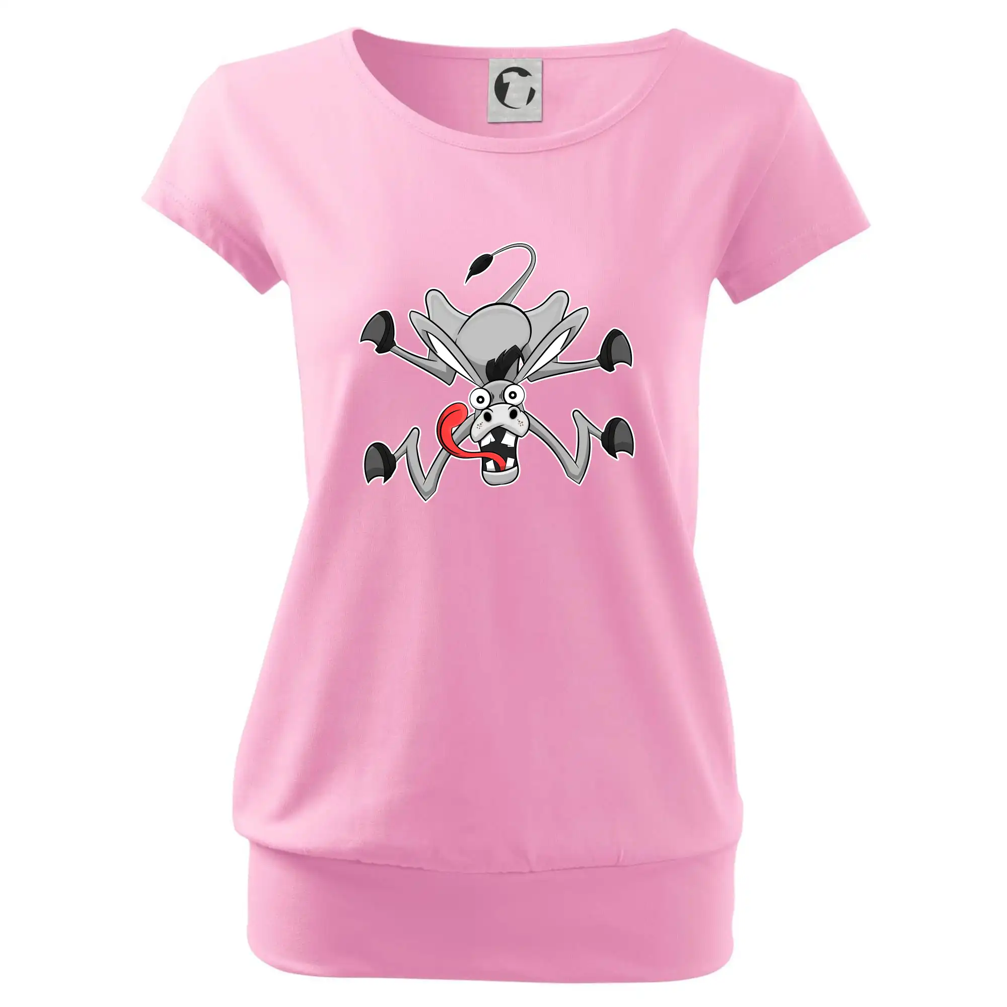 Trendové dámske tričko s veľmi krátkym rukávom, voľnejšieho strihu, v dolnom kraji všité do širokého lemu. Okrúhly priekrčník s úzkym lemom zo zhodného materiálu.