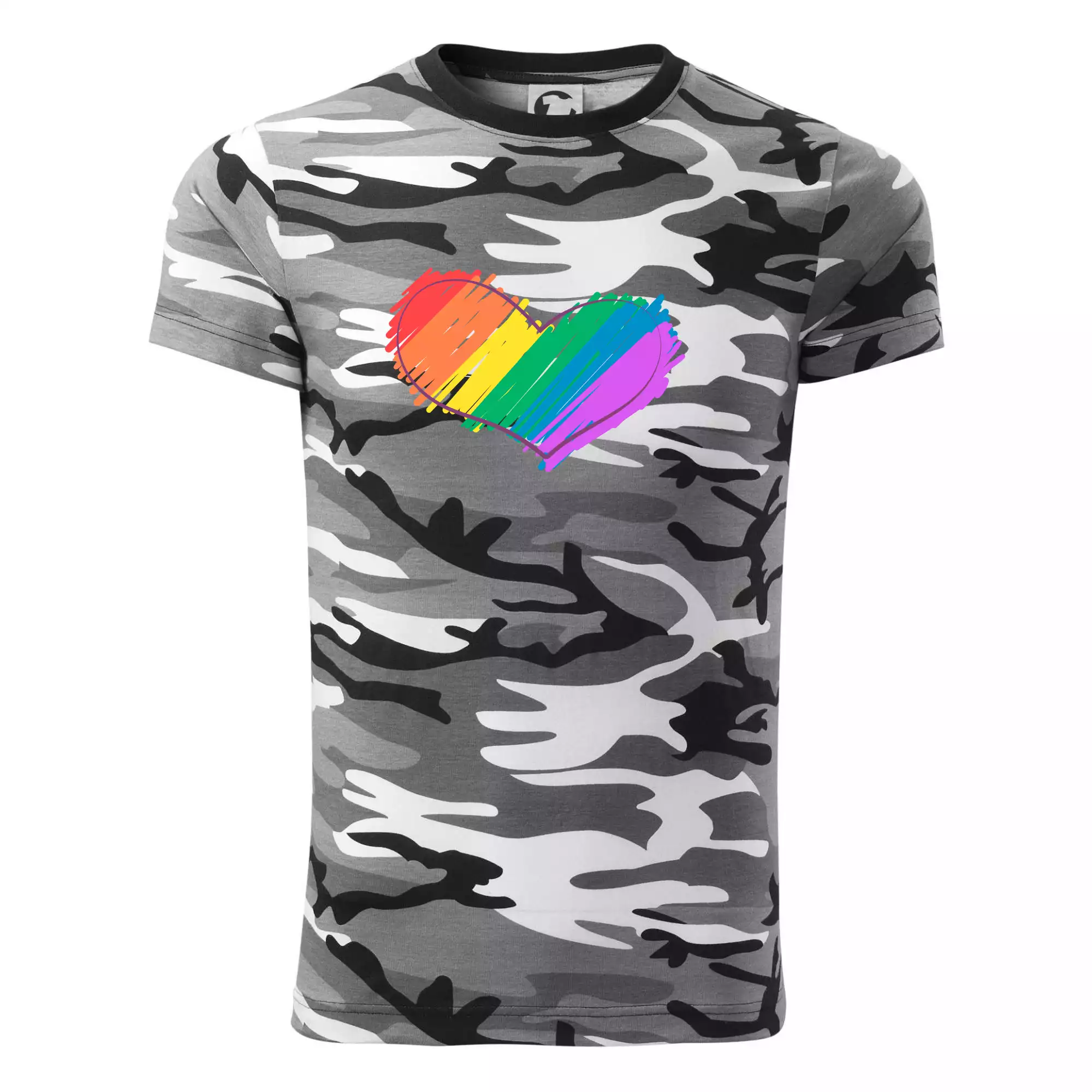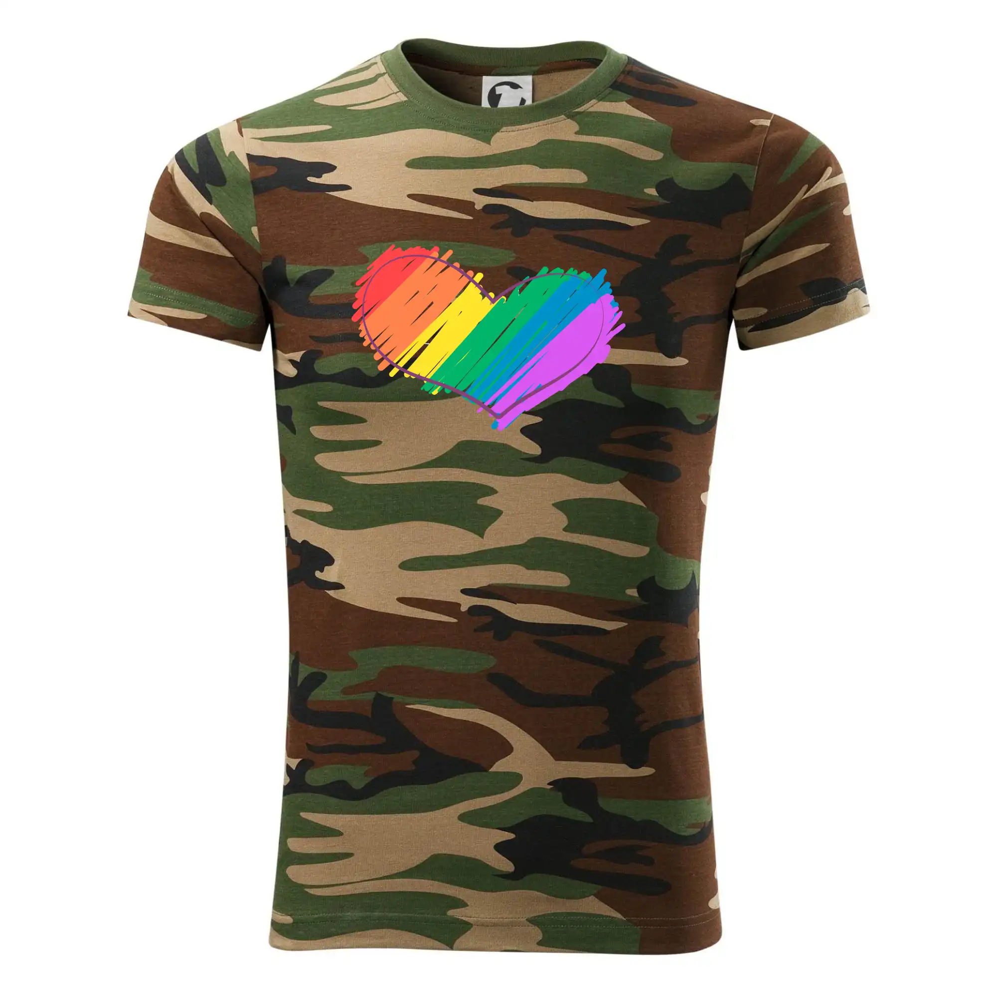 Tričko strednej gramáže vo farbách camouflage. Strih s bočnými švami. Lem priekrčníku z rebrového úpletu s prídavkom 5% elastanu. Vnútorná časť zadného priekrčníka začistená páskou vo farbe camouflage.