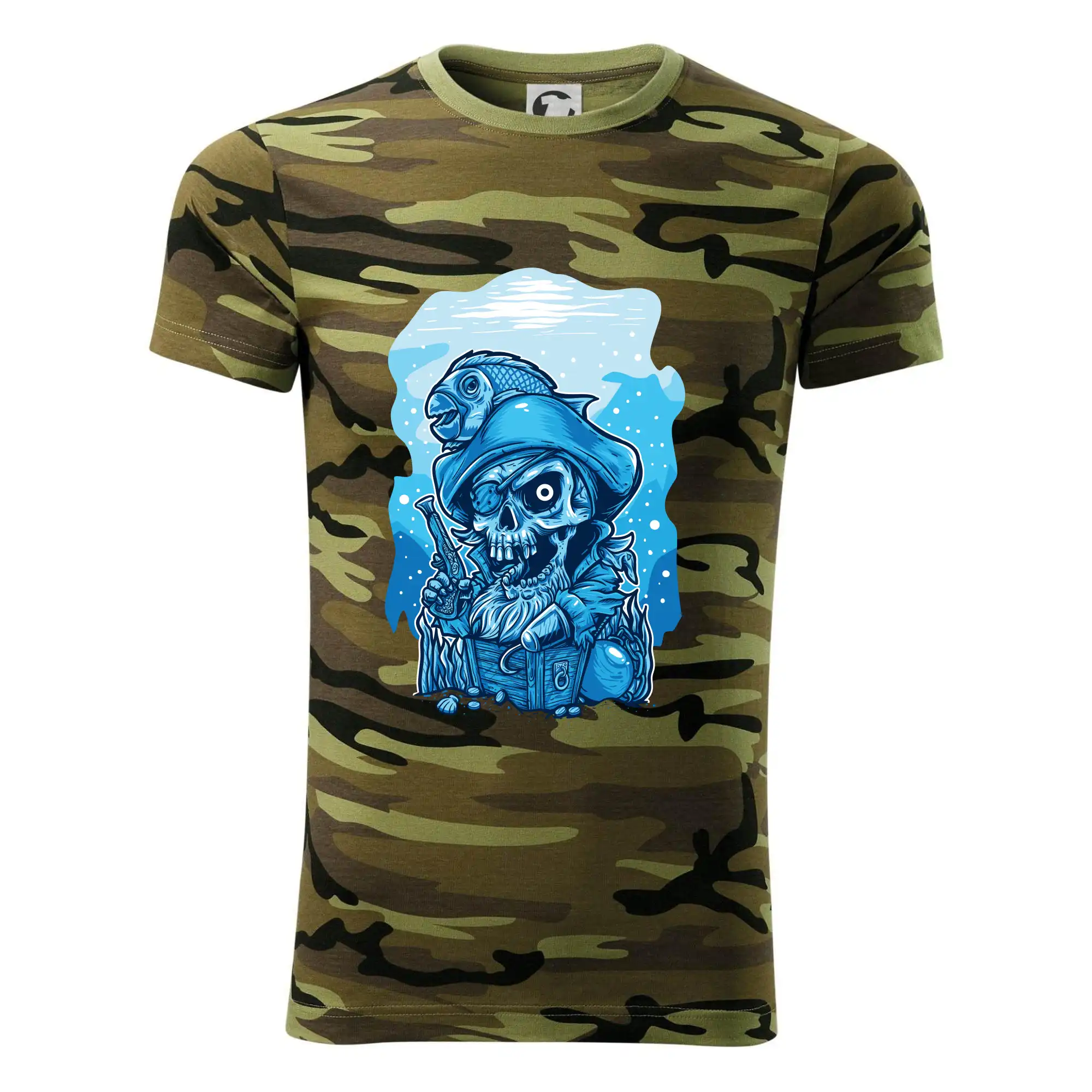 Tričko strednej gramáže vo farbách camouflage. Strih s bočnými švami. Lem priekrčníku z rebrového úpletu s prídavkom 5% elastanu. Vnútorná časť zadného priekrčníka začistená páskou vo farbe camouflage.