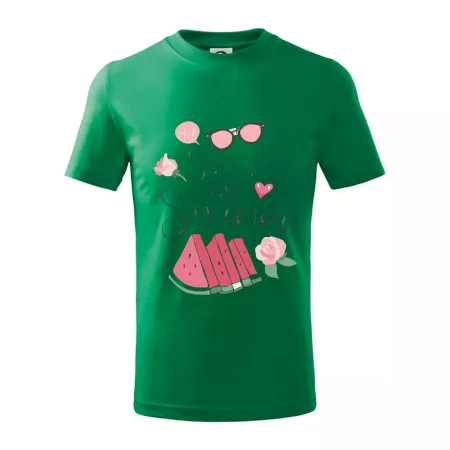 Detské tričko strednej gramáže s bočnými švami. Úzky priekrčník s prídavkom 5% elastanu. Vnútorná časť zadného priekrčníka začistená tkanou páskou. Spevnený ramenný šev.