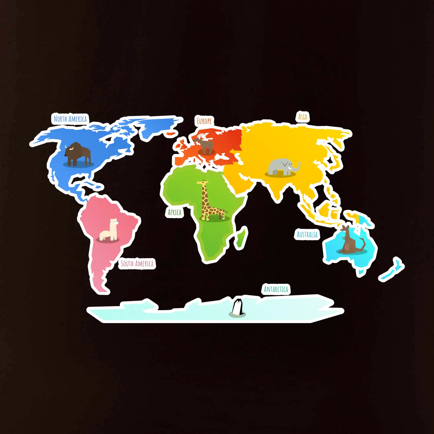 Svetové kontinenty s názvami a zvieratkami