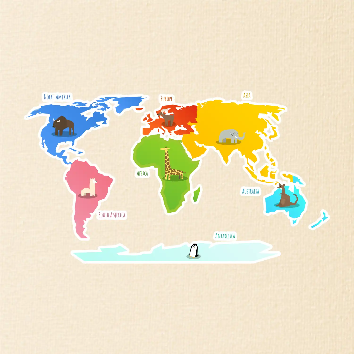 Svetové kontinenty s názvami a zvieratkami