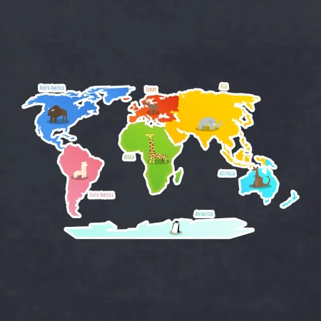 Svetové kontinenty s názvami a zvieratkami