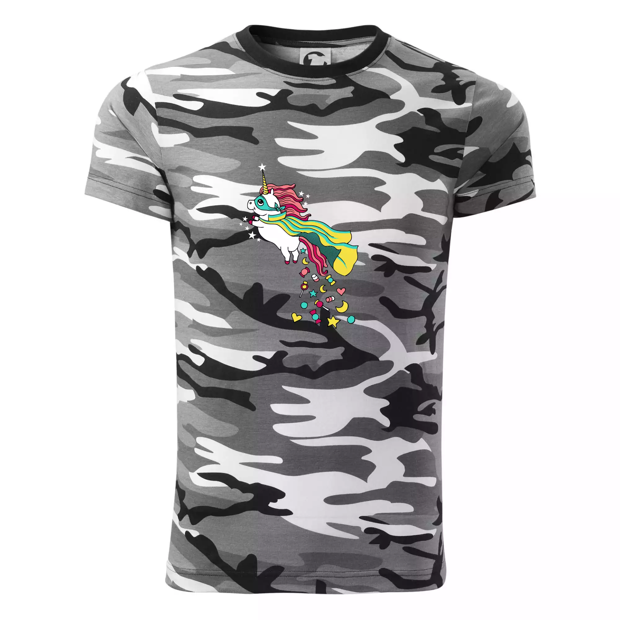 Tričko strednej gramáže vo farbách camouflage. Strih s bočnými švami. Lem priekrčníku z rebrového úpletu s prídavkom 5% elastanu. Vnútorná časť zadného priekrčníka začistená páskou vo farbe camouflage.