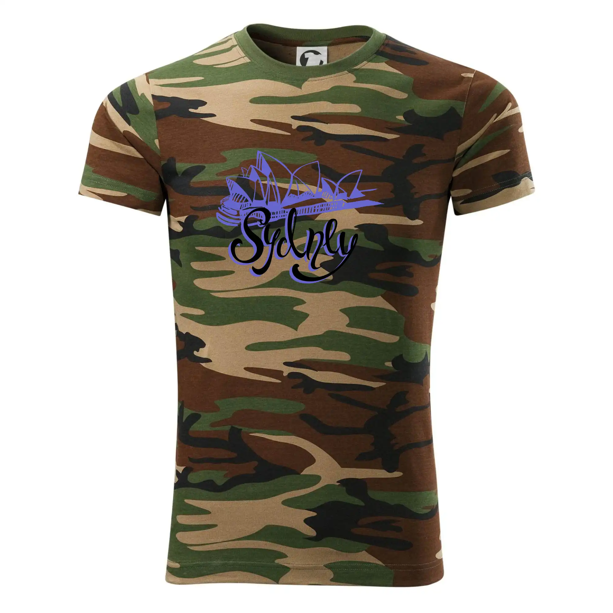 Tričko strednej gramáže vo farbách camouflage. Strih s bočnými švami. Lem priekrčníku z rebrového úpletu s prídavkom 5% elastanu. Vnútorná časť zadného priekrčníka začistená páskou vo farbe camouflage.