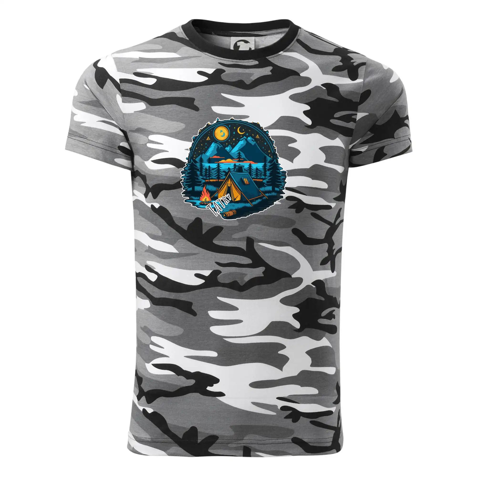 Tričko strednej gramáže vo farbách camouflage. Strih s bočnými švami. Lem priekrčníku z rebrového úpletu s prídavkom 5% elastanu. Vnútorná časť zadného priekrčníka začistená páskou vo farbe camouflage.