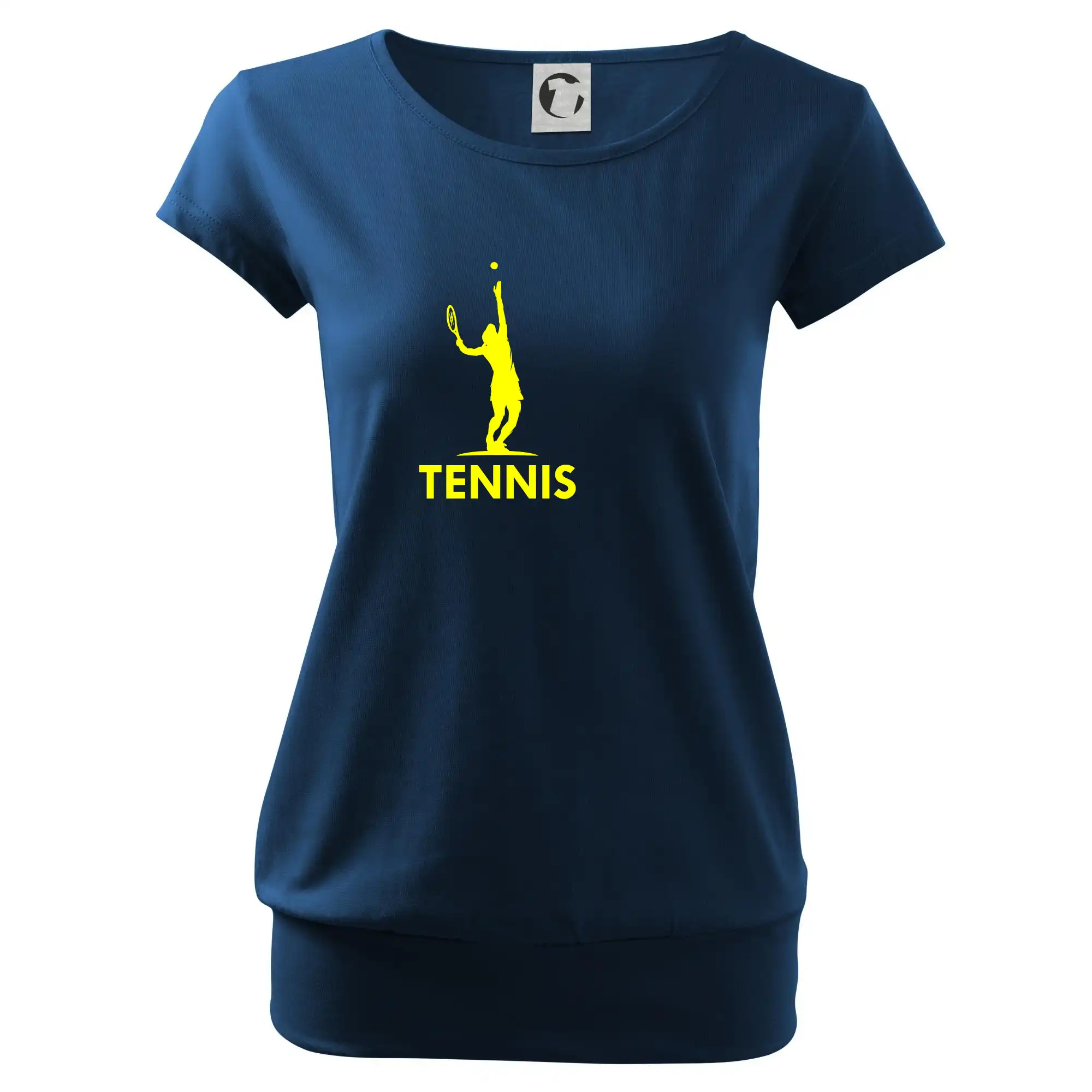 Trendové dámske tričko s veľmi krátkym rukávom, voľnejšieho strihu, v dolnom kraji všité do širokého lemu. Okrúhly priekrčník s úzkym lemom zo zhodného materiálu.