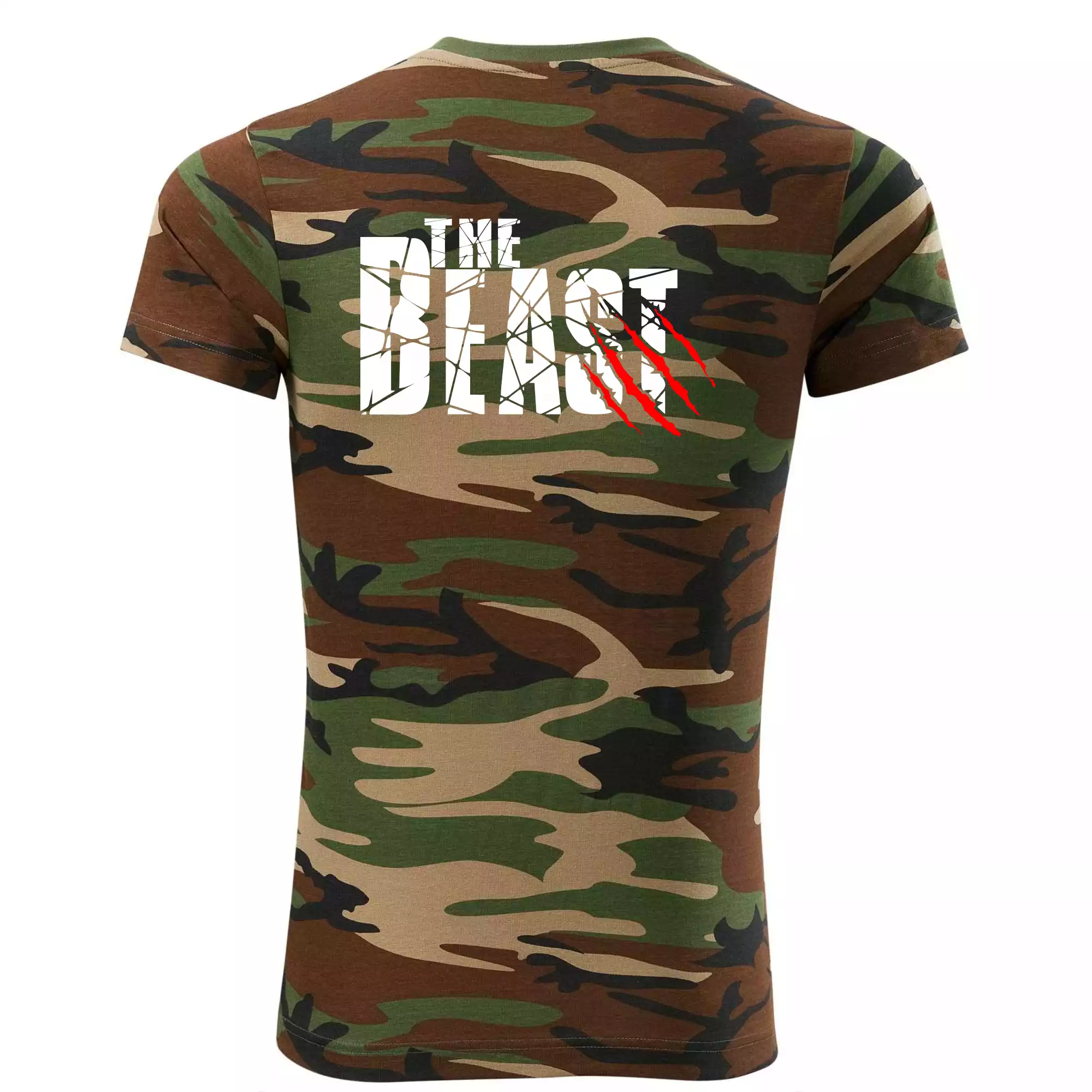 Tričko strednej gramáže vo farbách camouflage. Strih s bočnými švami. Lem priekrčníku z rebrového úpletu s prídavkom 5% elastanu. Vnútorná časť zadného priekrčníka začistená páskou vo farbe camouflage.