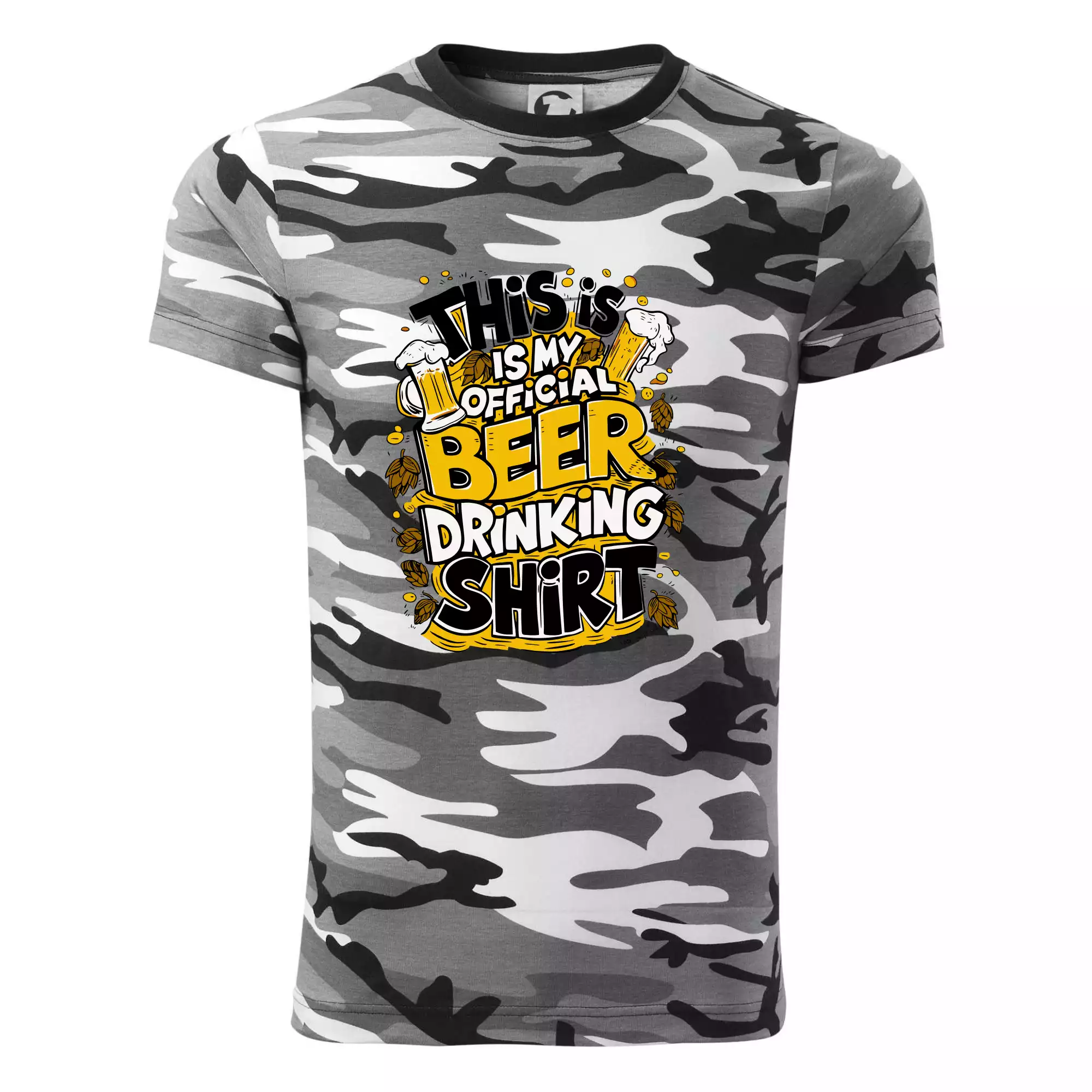 Tričko strednej gramáže vo farbách camouflage. Strih s bočnými švami. Lem priekrčníku z rebrového úpletu s prídavkom 5% elastanu. Vnútorná časť zadného priekrčníka začistená páskou vo farbe camouflage.