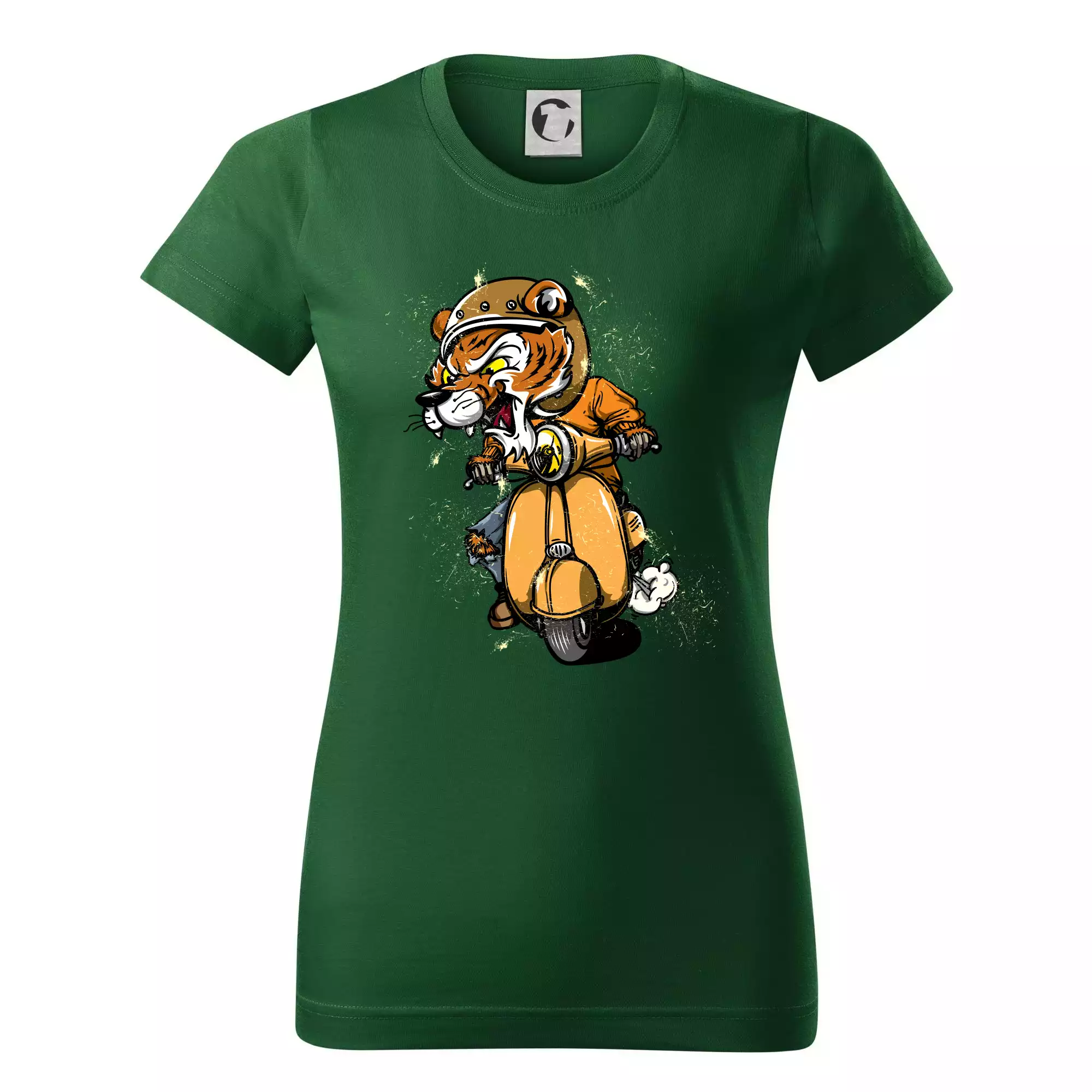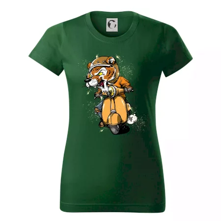 Tričko pre motorkára, na ktorom je tiger na skútri. Motorkárske tričko, kde je motorkár tiger, musí mať doma každý vášnivý motorkár. Tričko s tigromje vhodný darček pre motorkára.