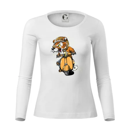 Tričko pre motorkára, na ktorom je tiger na skútri. Motorkárske tričko, kde je motorkár tiger, musí mať doma každý vášnivý motorkár. Tričko s tigromje vhodný darček pre motorkára.