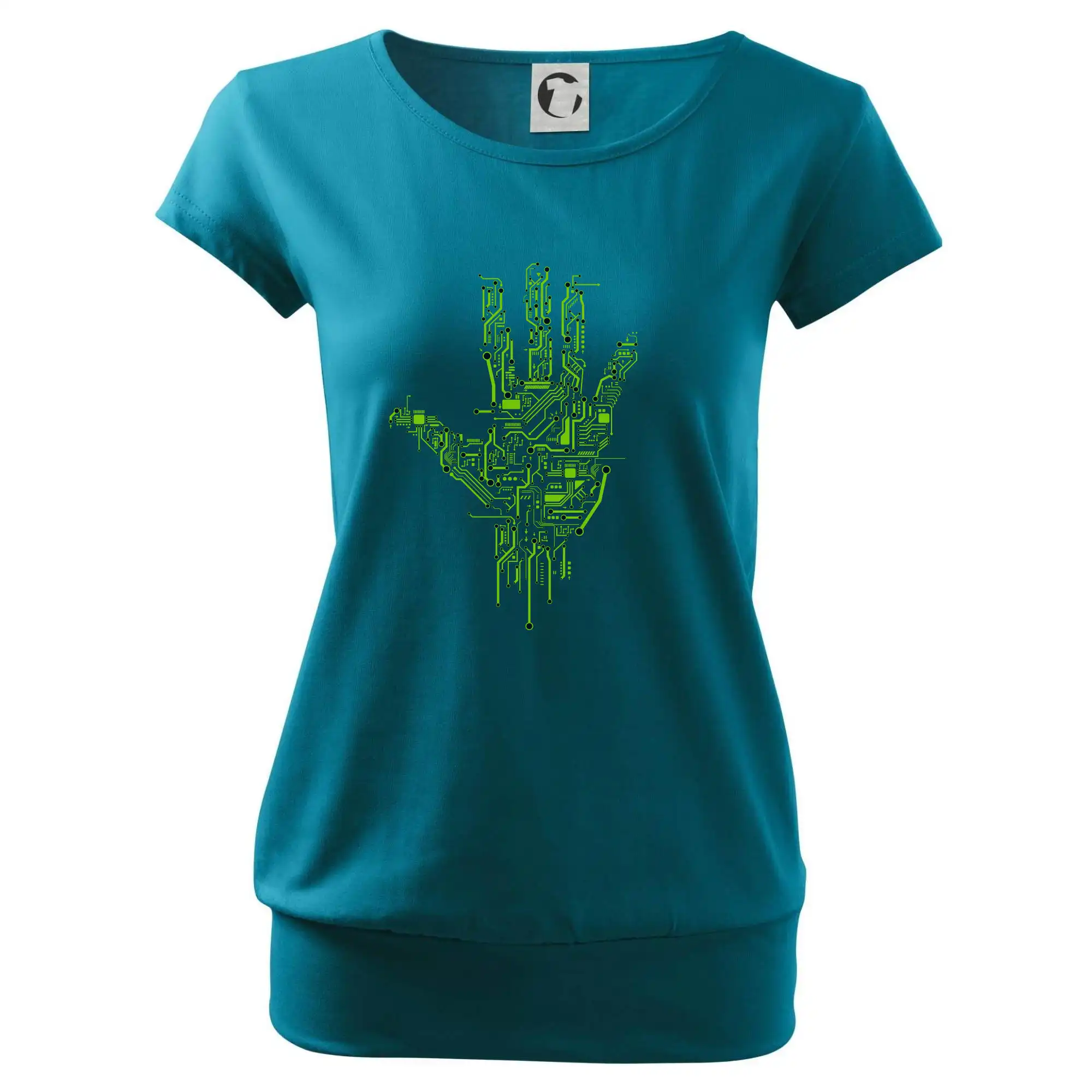 Trendové dámske tričko s veľmi krátkym rukávom, voľnejšieho strihu, v dolnom kraji všité do širokého lemu. Okrúhly priekrčník s úzkym lemom zo zhodného materiálu.