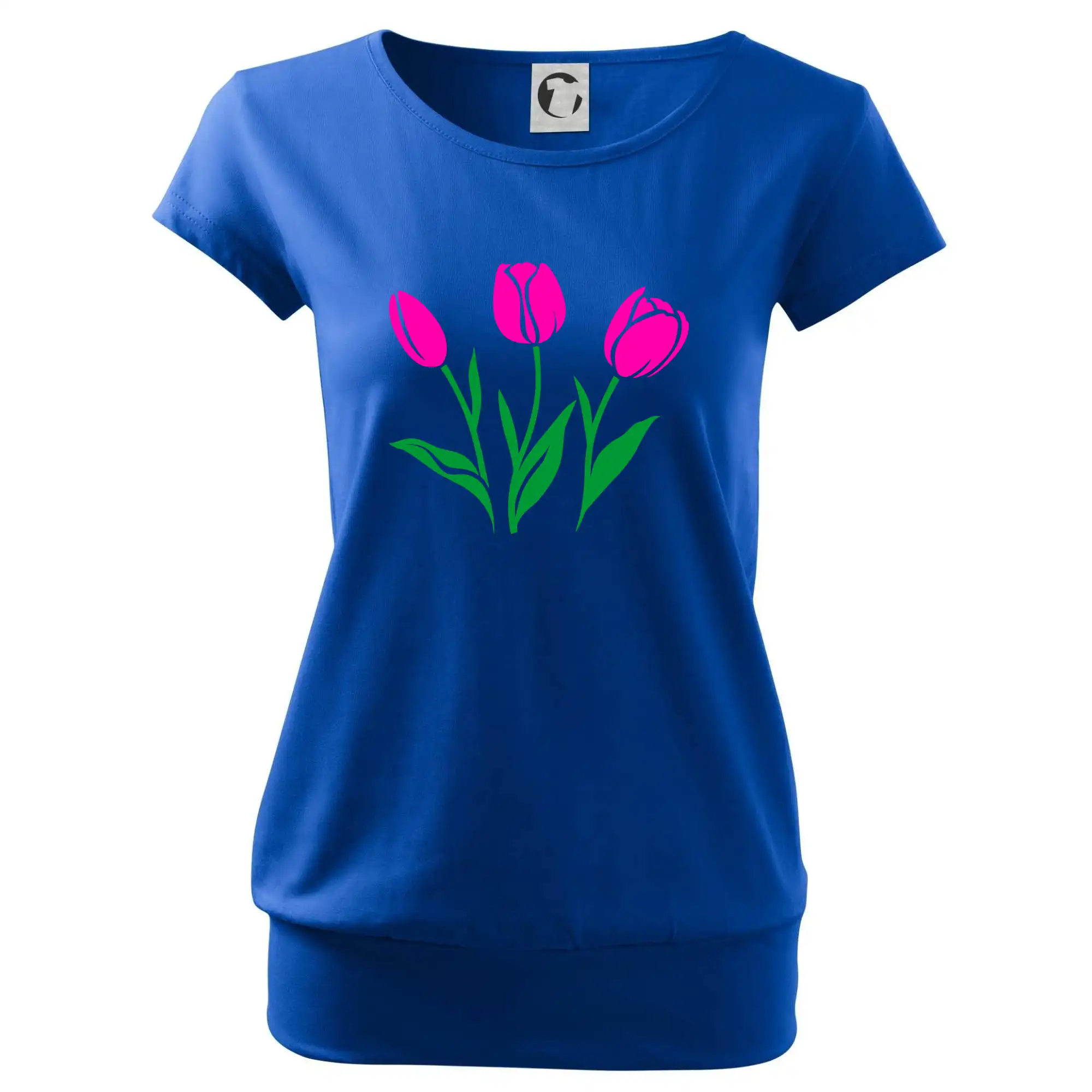Trendové dámske tričko s veľmi krátkym rukávom, voľnejšieho strihu, v dolnom kraji všité do širokého lemu. Okrúhly priekrčník s úzkym lemom zo zhodného materiálu.