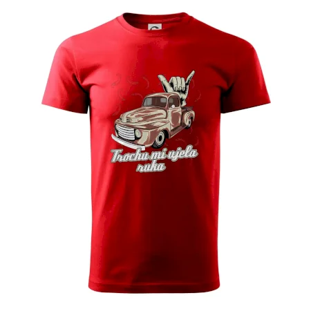 Vtipné tričko pre kuchára s nápisom "Trochu mi ušla ruka" s chilli papričkami. Pálivé papričky sa musia pridávať opatrne, niekedy sa to ale nepodarí a je ich v jedle toľko, že by to naštartovalo aj auto.