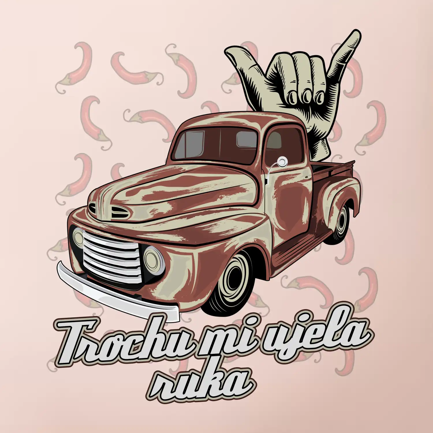 Vtipné tričko pre kuchára s nápisom "Trochu mi ušla ruka" s chilli papričkami. Pálivé papričky sa musia pridávať opatrne, niekedy sa to ale nepodarí a je ich v jedle toľko, že by to naštartovalo aj auto.