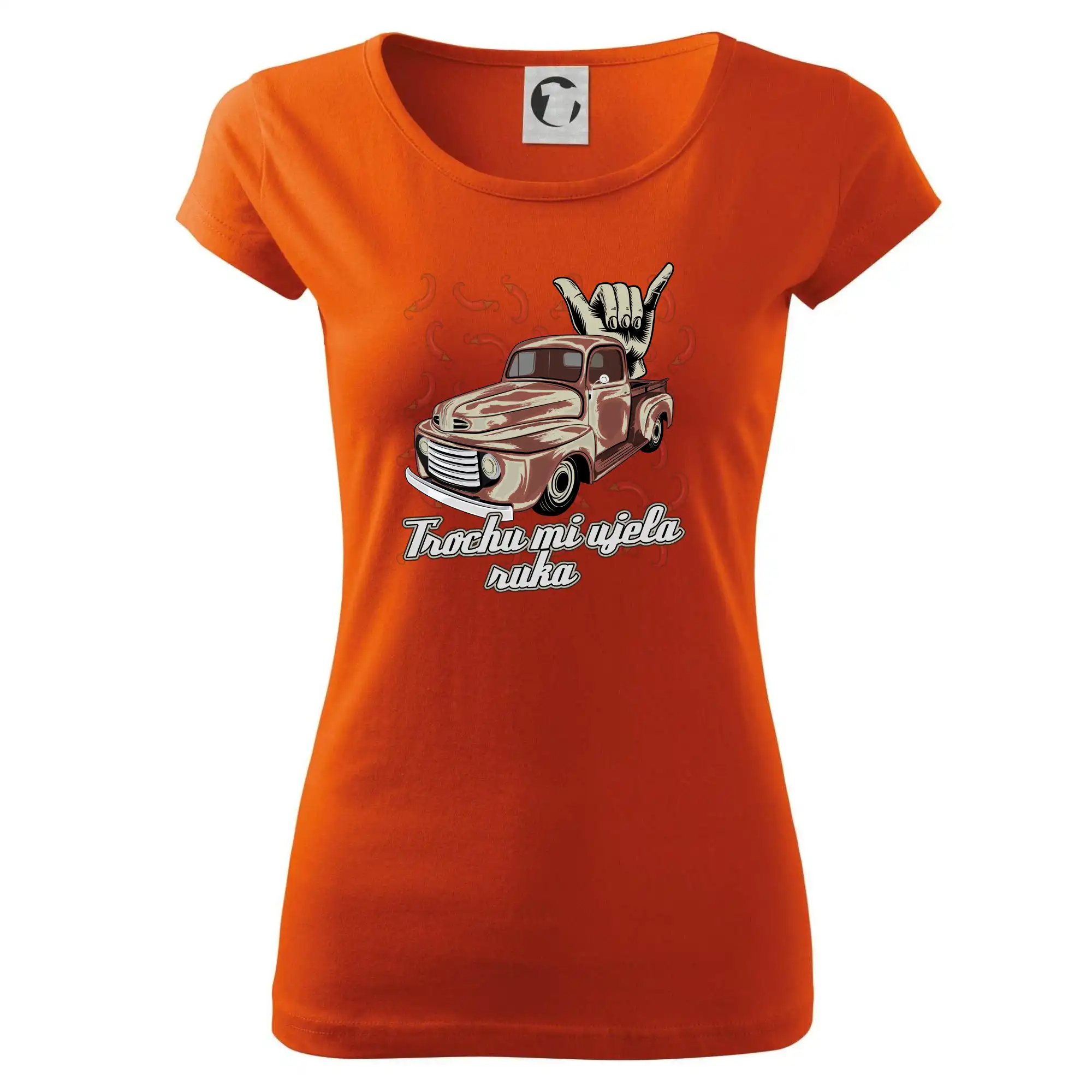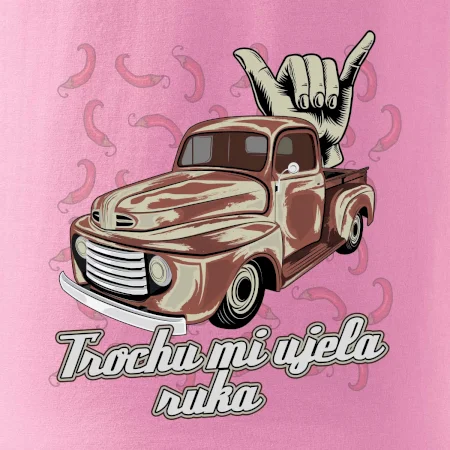 Vtipné tričko pre kuchára s nápisom "Trochu mi ušla ruka" s chilli papričkami. Pálivé papričky sa musia pridávať opatrne, niekedy sa to ale nepodarí a je ich v jedle toľko, že by to naštartovalo aj auto.